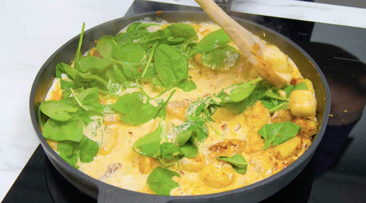 3. Gib Butter in eine Pfanne und brate die Gnocchi darin an. Wenn die Gnocchi Farbe bekommen haben, füge Zwiebeln, Knoblauch und getrocknete Tomaten hinzu. Dann kommen noch Gewürze und Tomatenmark mit in die Pfanne. Lösche alles mit Sahne ab, füge den Babyspinat hinzu und lasse alles kurz durchkochen.
