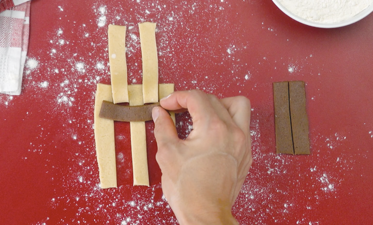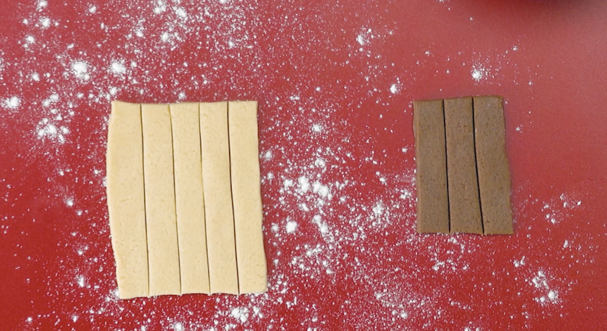 2.1 Du brauchst 5 gleich dicke und gleich lange Streifen vom hellen Teig und 3 gleich dicke, etwas kürzere Streifen vom dunklen Teig.