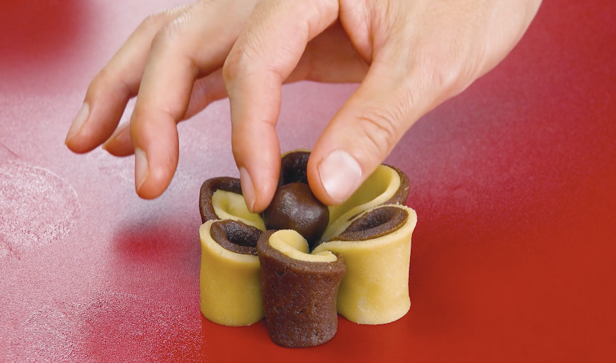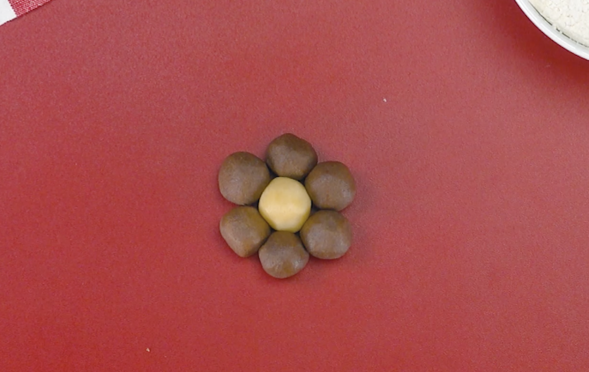 5.4 Forme nun aus den Halbkreisen abwechselnd (einmal den hellen Teig nach außen zeigend, einmal den dunklen Teig nach außen zeigend) ein Blütenblatt. In die Mitte legst du noch eine kleine dunkle Teigkugel.