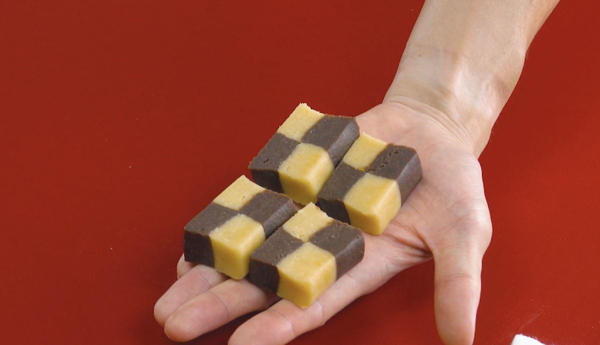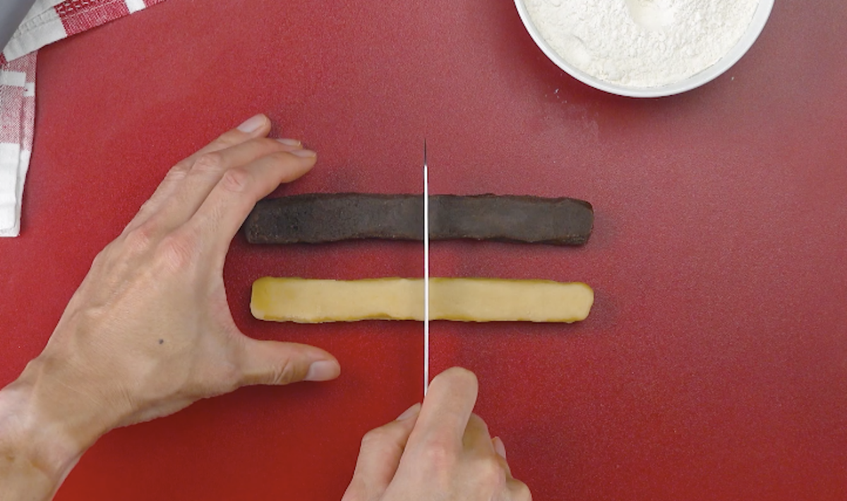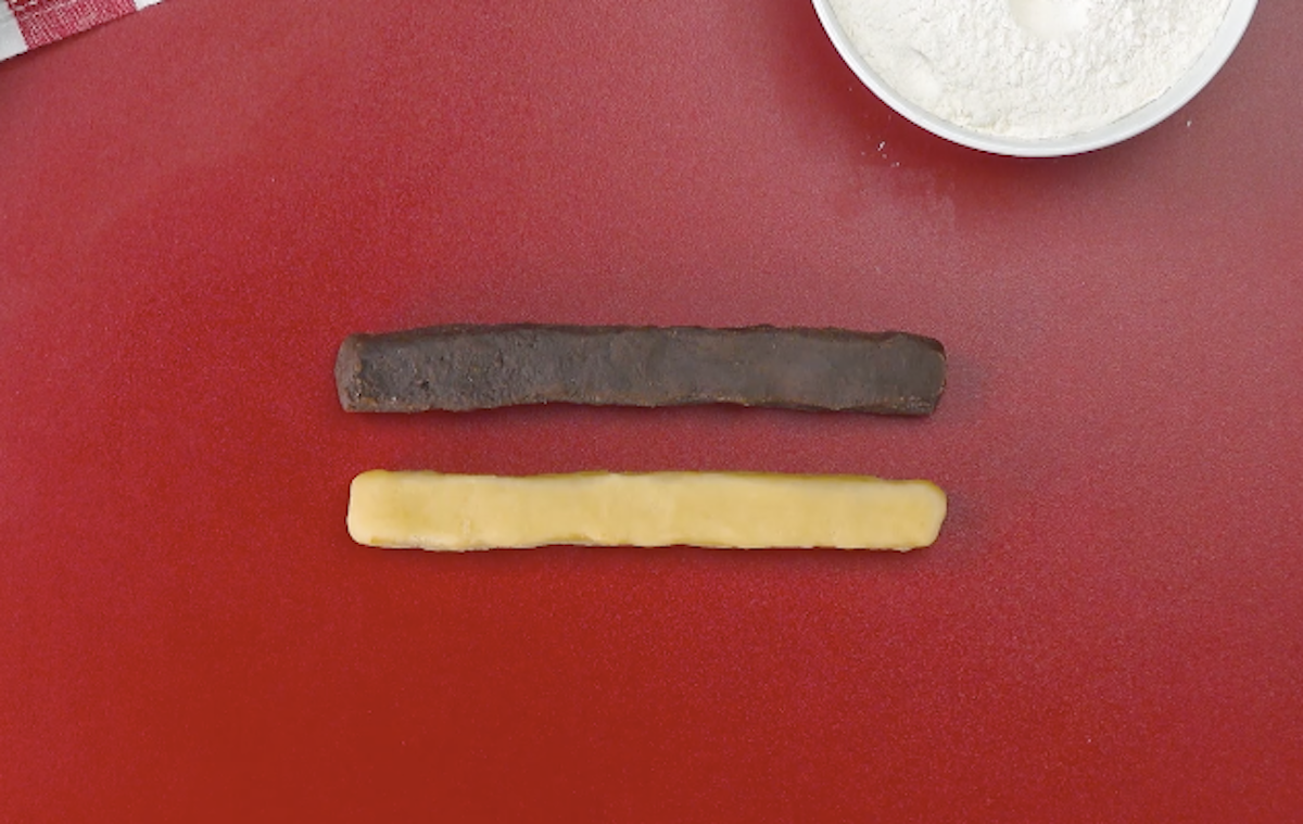 4.1 Forme aus dem hellen und dem dunklen Teig zwei gleich dicke und gleich lange Quader.