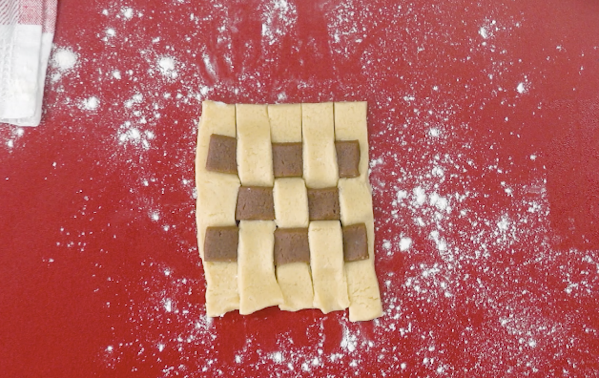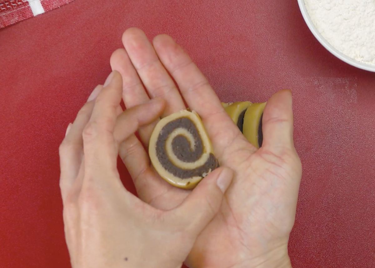 Lege ein rechteckiges Stück dunklen Teigs auf ein rechteckiges Stück hellen Teigs. Rolle sie dann zusammen und schneide die Teig-Rolle in Scheiben.