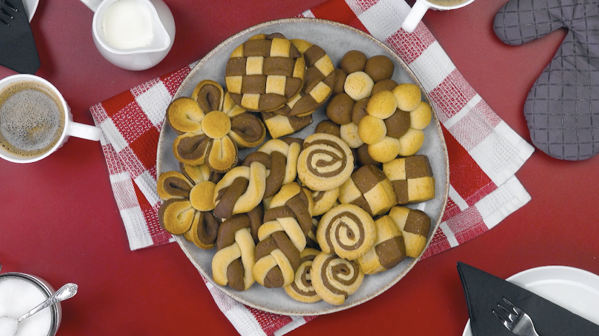 Plätzchen backen kann und muss man nicht nur zur Weihnachtszeit. Das ganze Jahr über kann man die tollsten Kreationen ausprobieren. Folgende 5 Tricks zeigen dir, wie einfach es ist, aus einem zweifarbigen Teig die schönsten Kekse zuzubereiten. Alles, was du brauchst, sind ein einfacher Mürbeteig, ein paar Küchenutensilien und Freude am Backen.