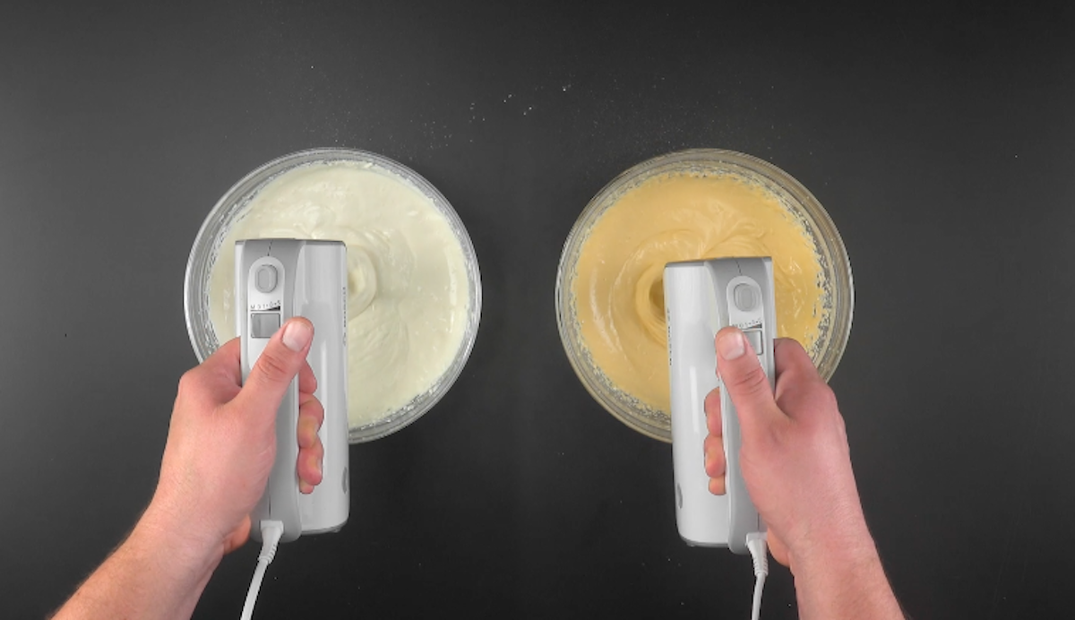 3. Gib nun Öl, Vanillearoma, Milch und Backpulver in den in der Zutatenliste für beide Teige genannten Mengen hinzu. Siebe dabei das Mehl in die Schüsseln und vermische alles nochmals mit einem Handrührgerät.