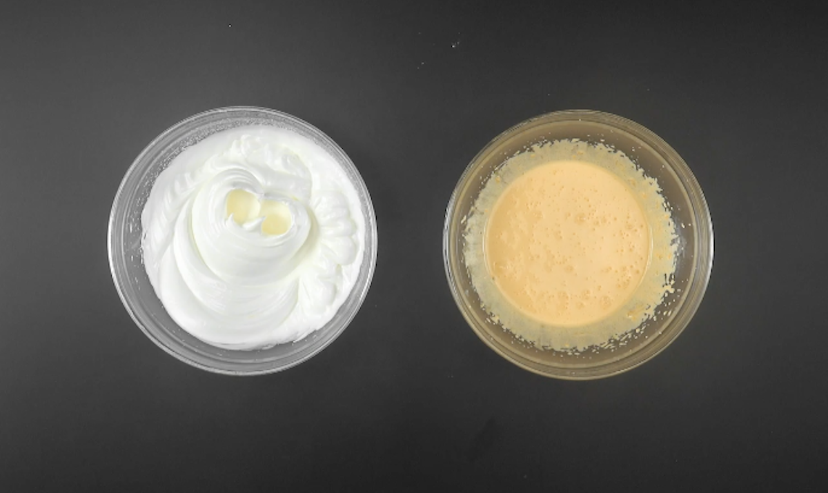 2. Gib zum Eiweiß 160 g Zucker und zum Eigelb 80 g Zucker hinzu. Schlage die Zutaten in beiden Schüsseln mit einem Handrührgerät steif.