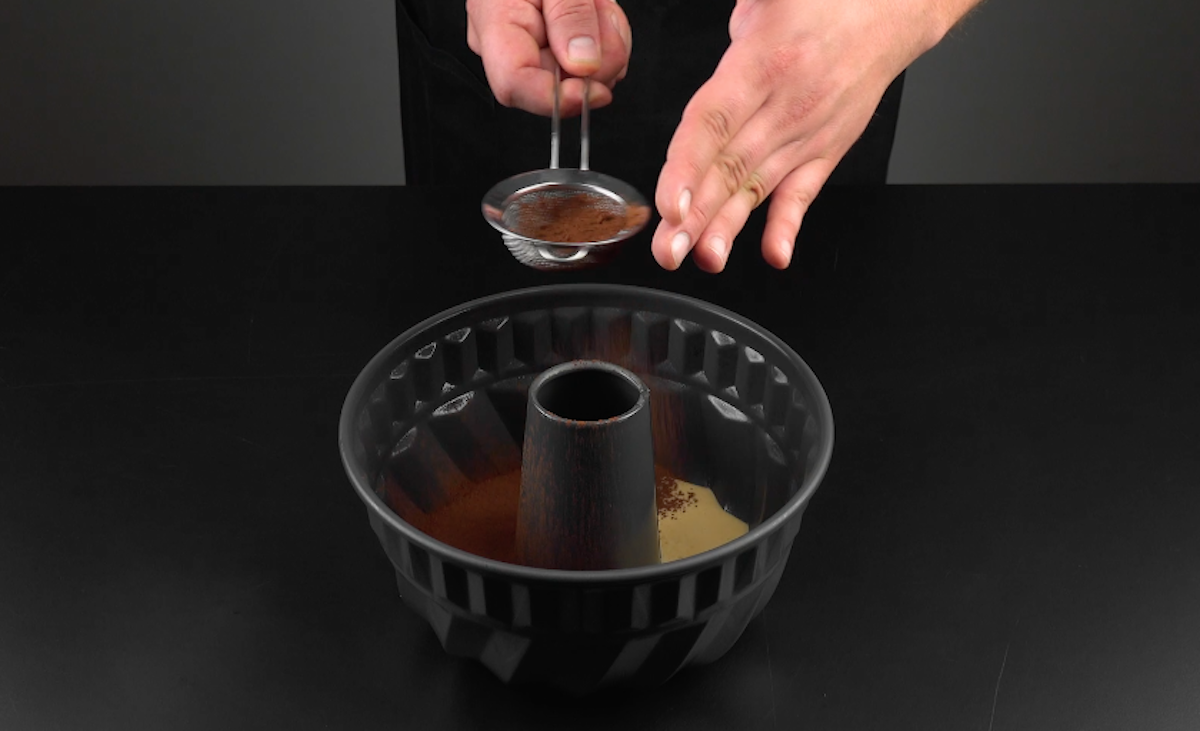 5. Gieße nun die Hälfte des hellen Teiges in die Form und bestreue den Teig danach flächig mit Kakaopulver. Gieße nun erst den restlichen gelben Teig in die Form, siebe Kakao darüber und gieße abschließend den restlichen hellen Teig obenauf. Schiebe die Kuchenform für ca. 40 Minuten in den vorgeheizten Backofen.