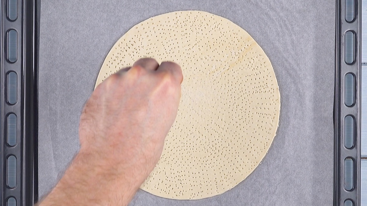 So geht es: 1.) Schneide aus den Blätterteigrollen vier gleich große Kreise aus. Stich diese dann flächendeckend mit einer Gabel ein und bestreue sie anschließend mit Zucker.