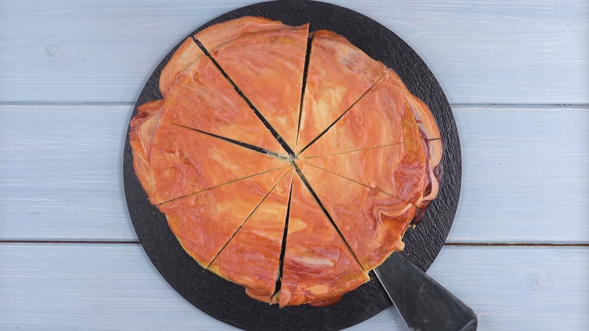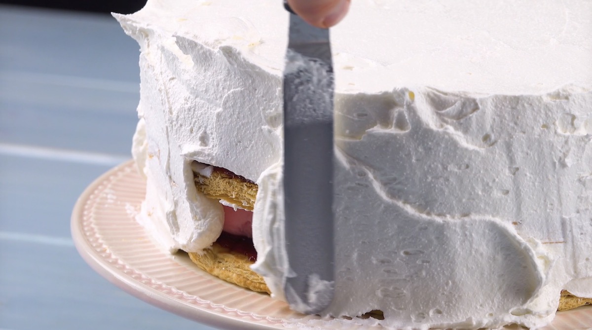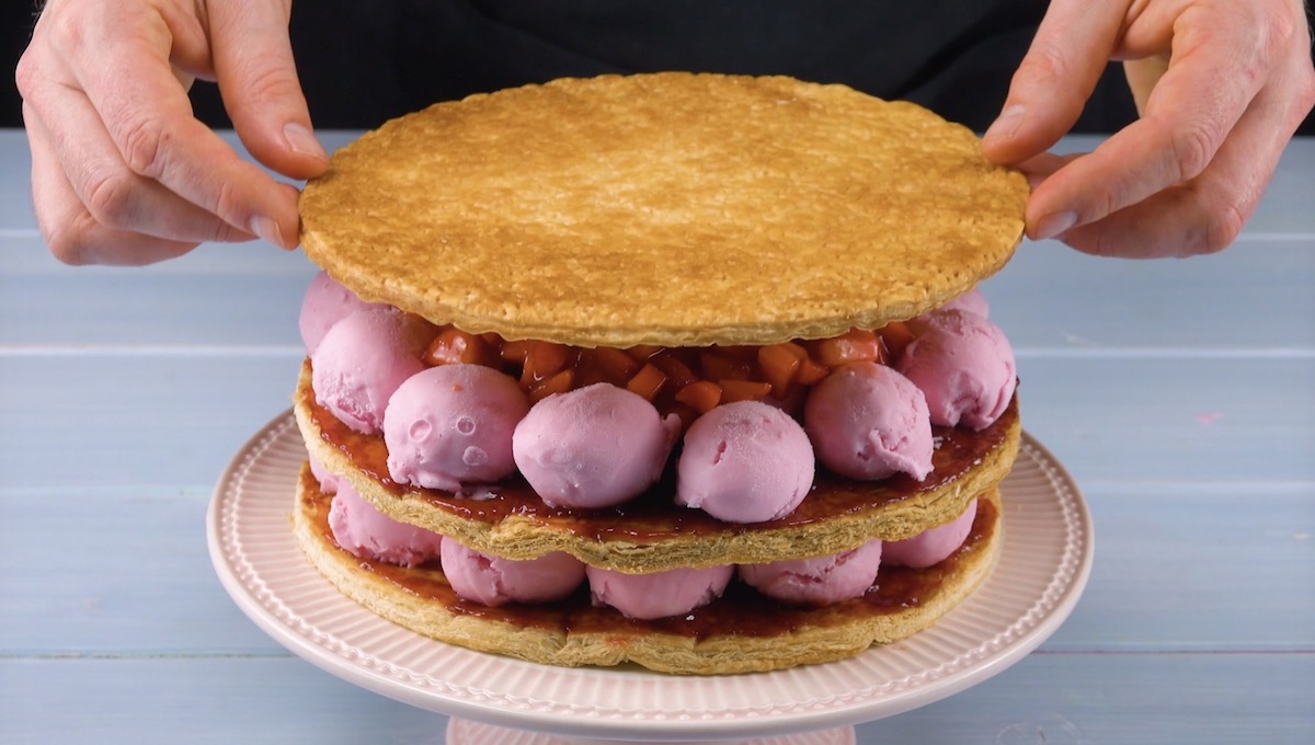 3.) Lass die Blätterteigkreise vollständig abkühlen. Währenddessen kannst du schon mal das Erdbeerkompott herstellen: Schneide dafür 400 g Erdbeeren klein und vermische sie mit 300 ml fertiger Erdbeerdessertsoße. Bestreiche nun den ersten Blätterteigkreis mit Erdbeermarmelade und bedecke ihn komplett mit Erdbeereiskugeln. Verteile die Hälfte des Kompotts auf dem Eis und lege den zweiten Blätterteigkreis obendrauf. Bestreiche auch diesen mit Erdbeermarmelade, verteile Erdbeereiskugeln darauf und bedecke diese mit dem übrigen Kompott. Lege zum Abschluss einen dritten Blätterteigkreis obendrauf.