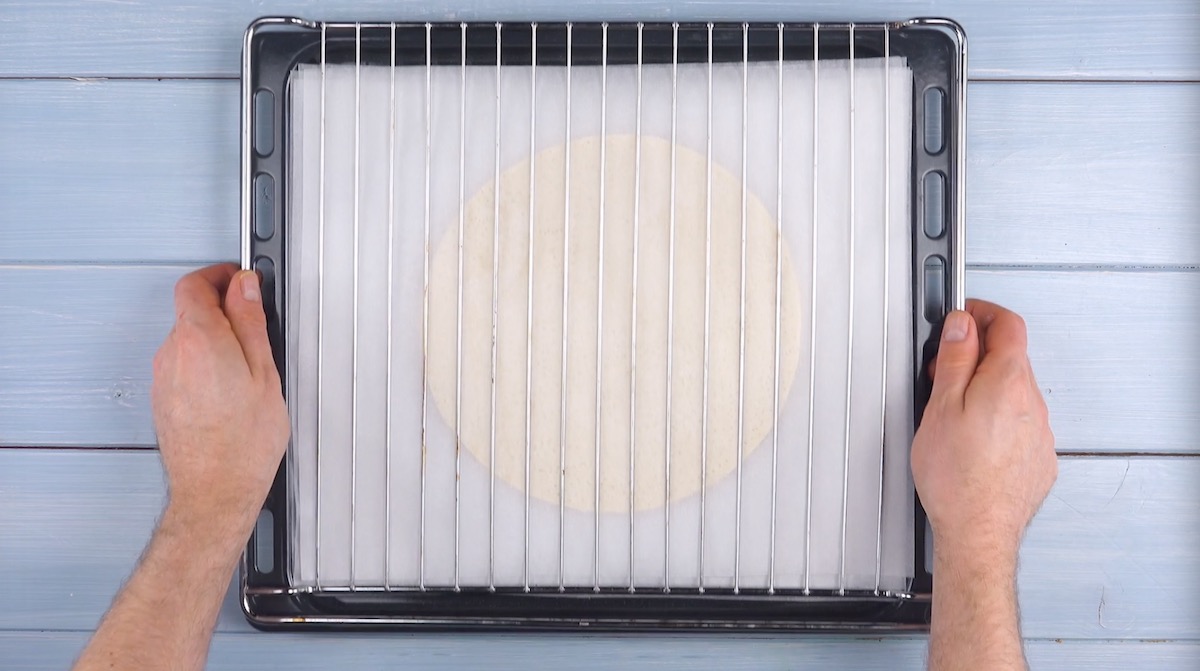 2.) Lege die gezuckerten Blätterteigkreise abwechselnd mit Backpapier übereinander. Beschwere das Ganze zum Beispiel mit einem Rost und backe die Kreise für 25 Minuten bei 190 °C Umluft.