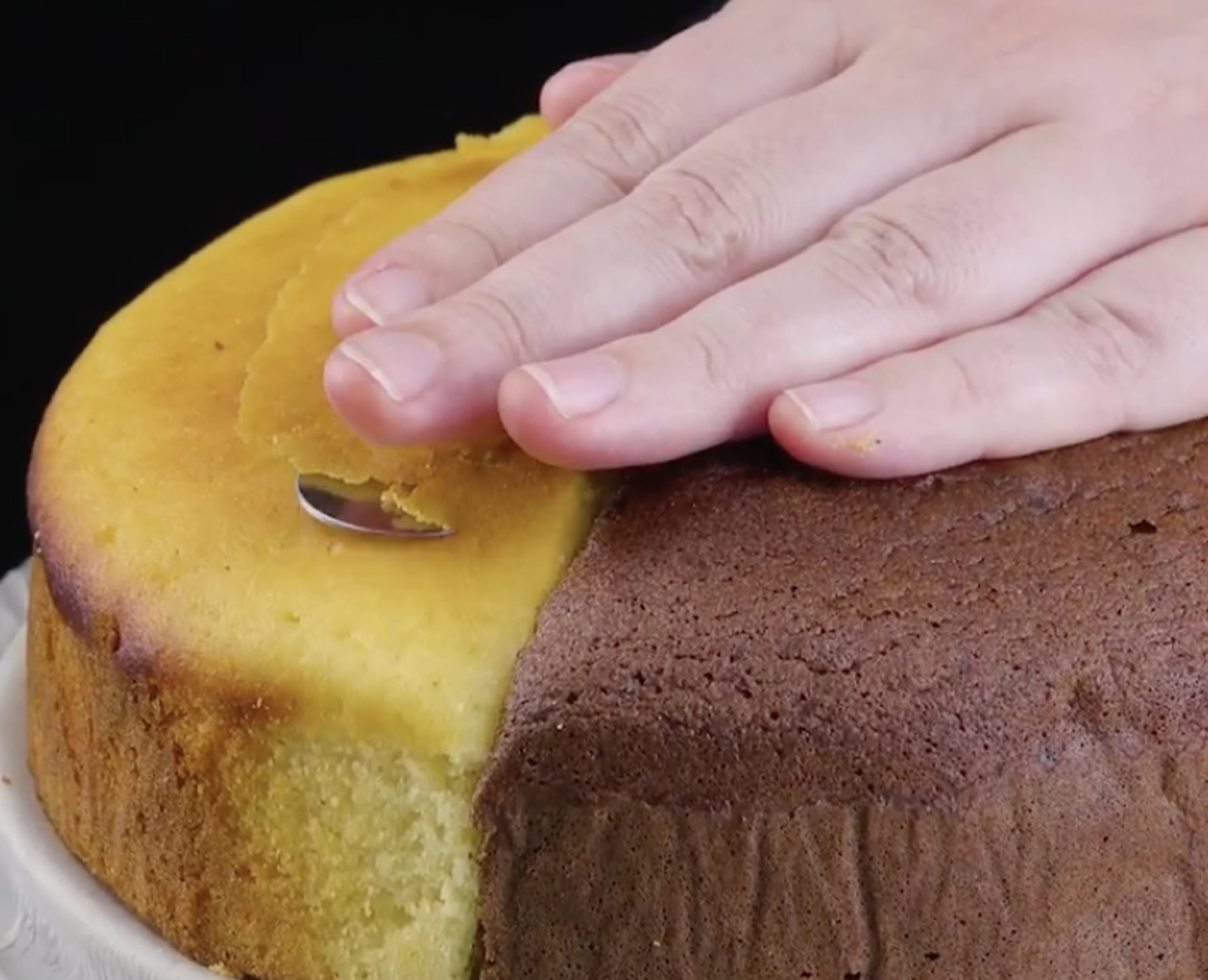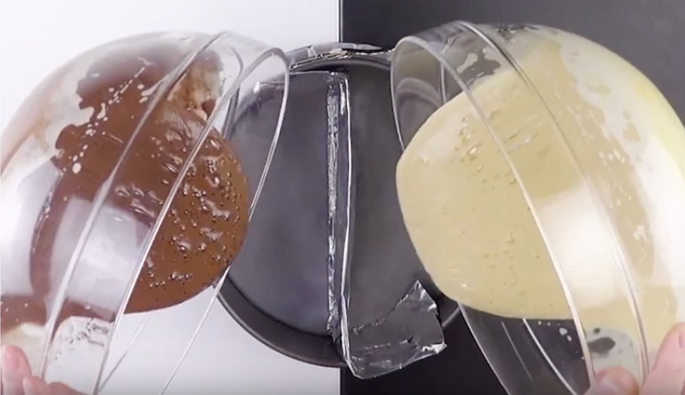 3.) Fülle die beiden vorbereiteten Teige in jeweils eine Seite der geteilten Kuchenform und backe den Kuchen für 40 Minuten bei 175 °C im Umluft-Modus.
