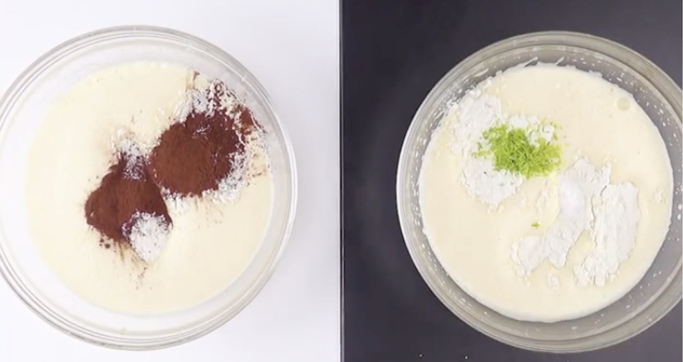 1.) Du benötigst zwei Schüsseln, in denen du jeweils zu gleichen Teilen Zucker, Eier und lauwarmes Wasser gut miteinander vermengst. In beide Schüsseln gibst du Mehl und Backpulver hinzu. In die eine Schale kommt nun Kakaopulver, in die andere abgeriebene Limettenschale. Den Inhalt beider Schüsseln verrührst du nun wieder miteinander, bis zwei glatte Teige entstehen.