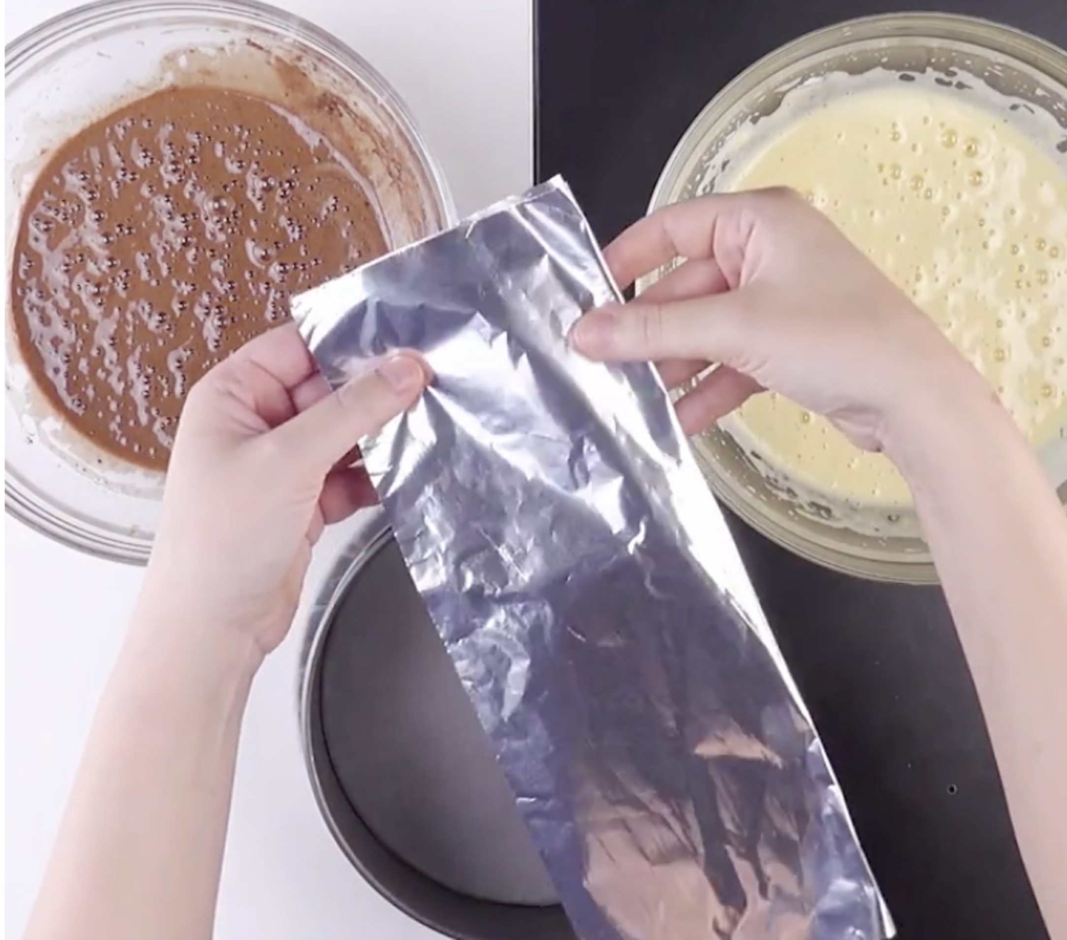 2.) Für die Kuchenform nimmst du dir zunächst ein Stück Alufolie und faltest dieses mehrmals zu einem länglichen Streifen zusammen. Mit diesem Streifen teilst du die Form in der Mitte in zwei etwa gleich große Bereiche ab, die Folienenden werden dafür etwas eingeknickt.
