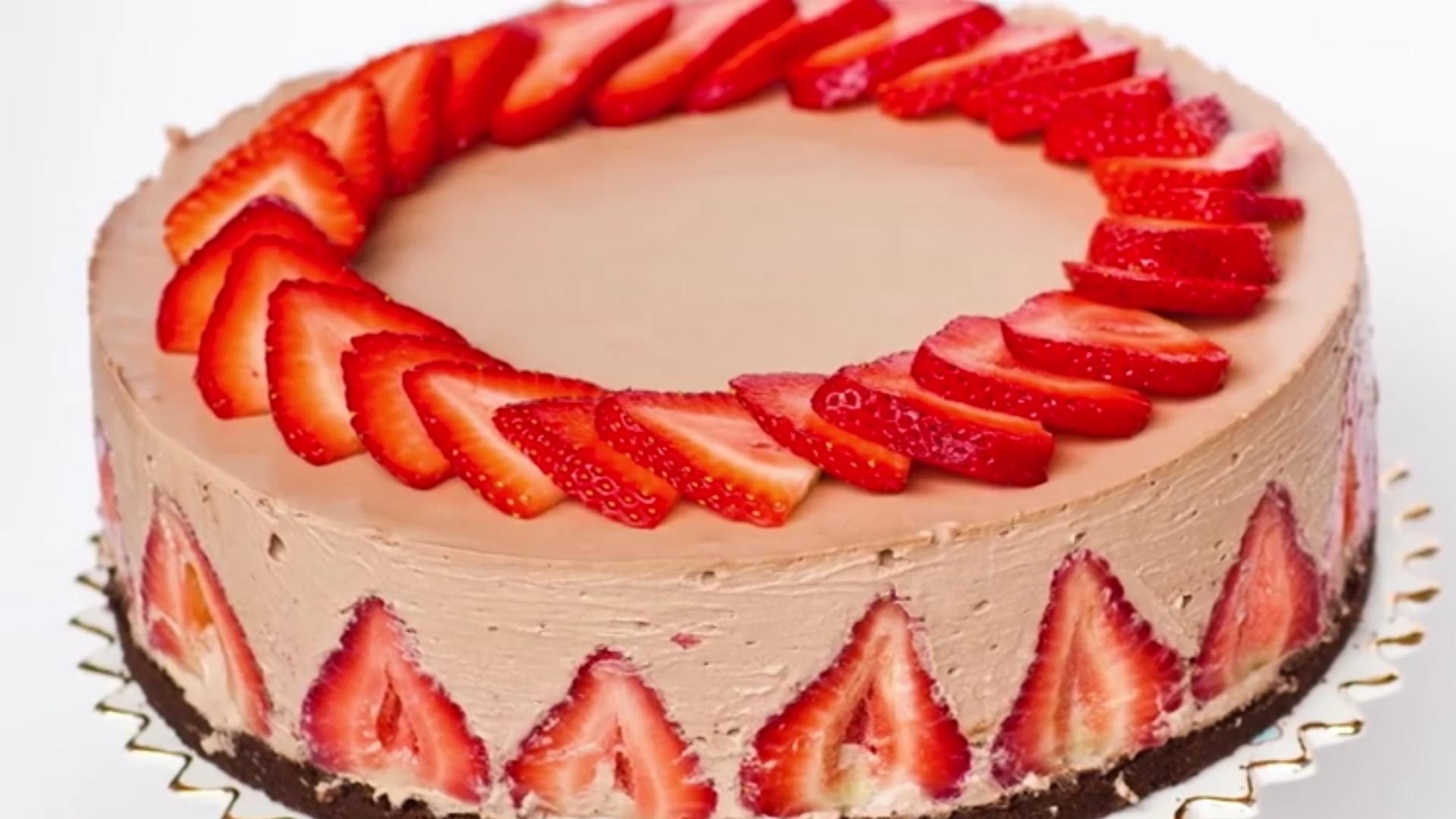 Halbiere Erdbeeren und stelle sie mit dem Kopf nach unten außen herum in die Creme.