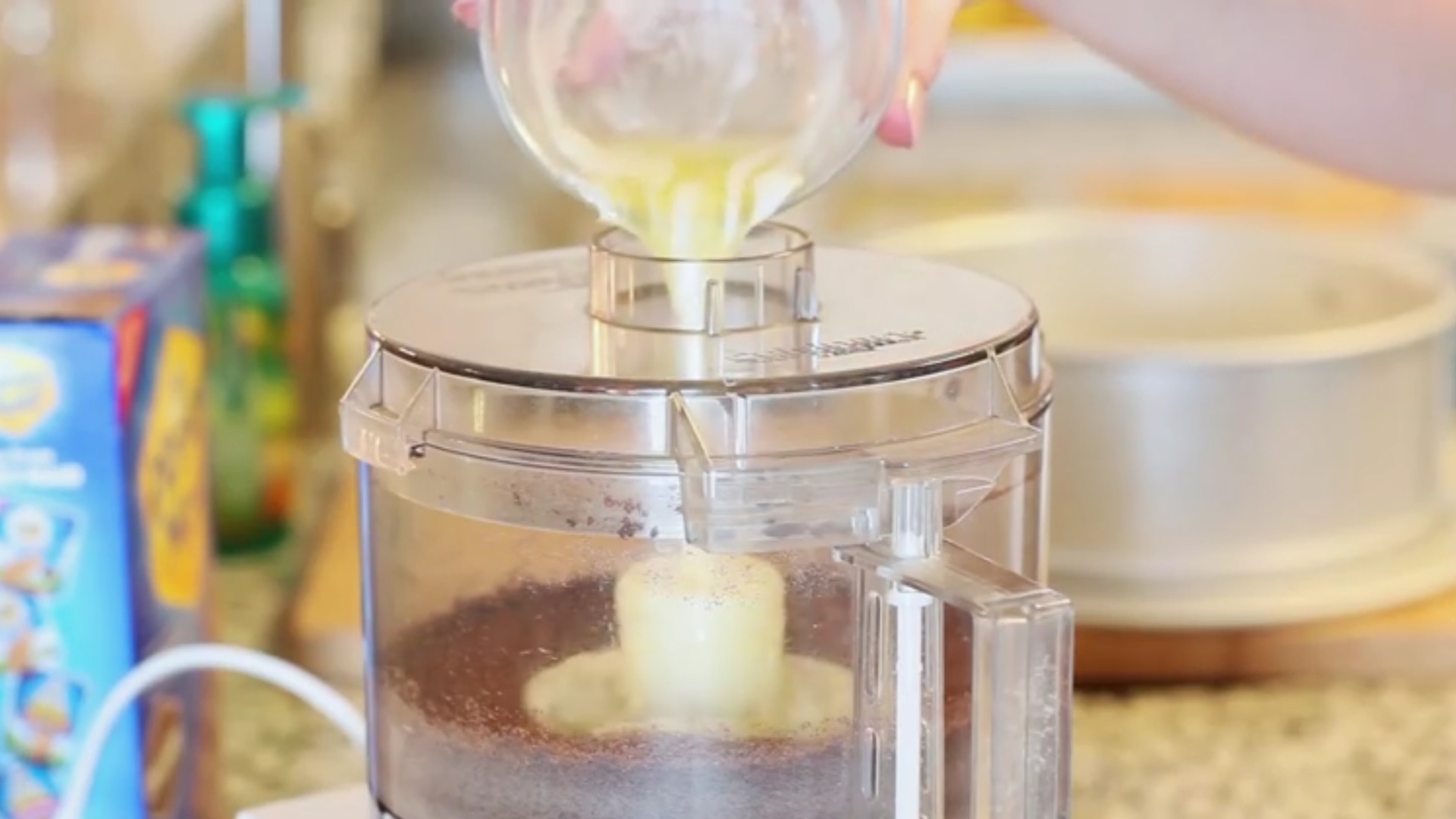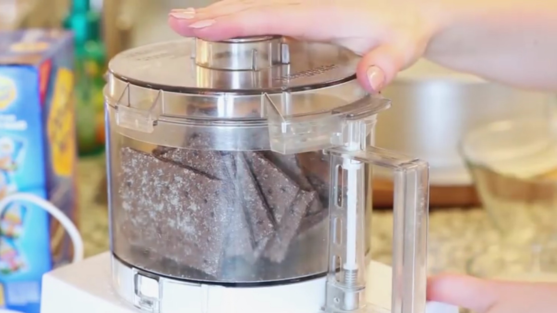 Erst musst du die Kekse richtig fein zerkrümeln. Das geht im Mixer, mit dem Pürierstab oder wenn du sie einfach in einen Gefrierbeutel gibst und mit dem Nudelholz rüberrollst.