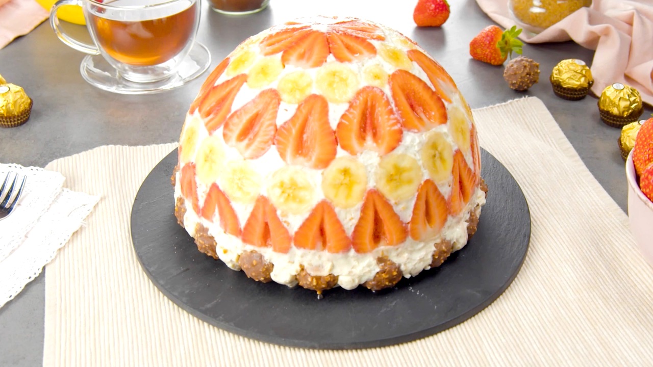 6. Stürze den Kuchen anschließend auf eine Kuchenplatte. Die Kuppeltorte sieht nicht nur klasse aus, sondern schmeckt auch einfach unglaublich cremig-lecker!