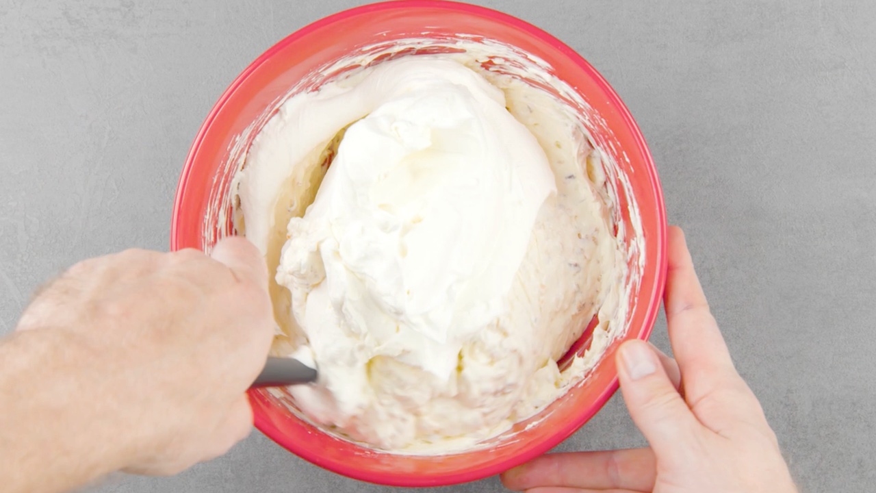 Tipp: Arbeite etwa 3-4 Blätter eingeweichte Gelatine in die Masse ein. Sie sorgt später für einen besseren Halt. Rühre für die Temperaturangleichung 2-3 EL der kühlen Creme unter die aufgelöste Gelatine und gib sie dann wieder zur Creme in der Schüssel hinzu.