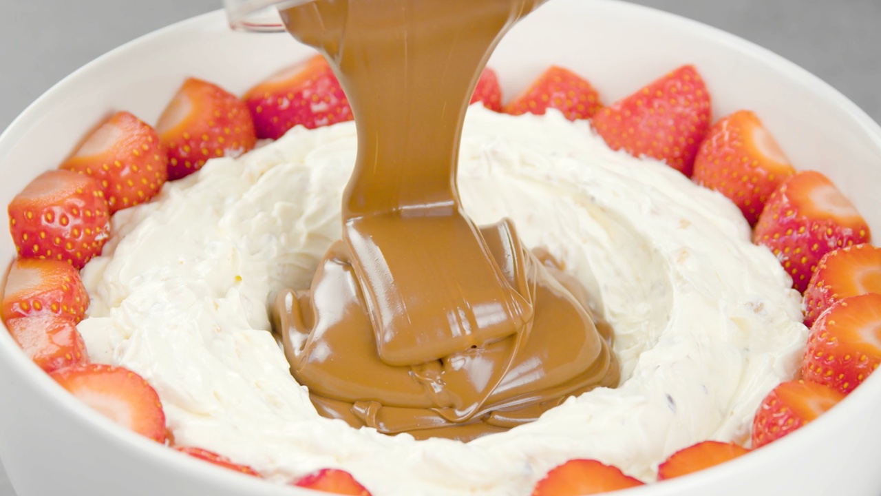 4. Hole die Schüssel nach der Kühlzeit wieder heraus und fülle die Schokoladencreme in die Mulde in der Mitte.