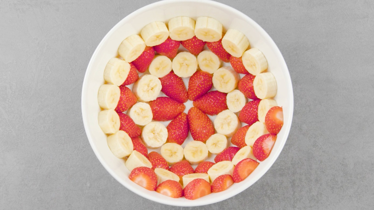 1. Halbiere die Erdbeeren, schneide die Bananen in Scheiben und platziere beide abwechselnd kreisförmig von unten nach oben in der Schüssel.