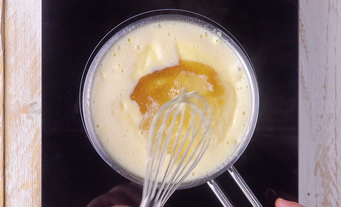 Stelle diese Mischung auf die heiße Herdplatte und rühre zunächst die Hälfte der heißen Milch mit einem Schneebesen ein. Gieße dann den Rest der Milch dazu und lass die Mischung unter ständigem Rühren bei geringer Hitze aufkochen, bis sie dickflüssig wird. Schalte die Herdplatte dann aus.