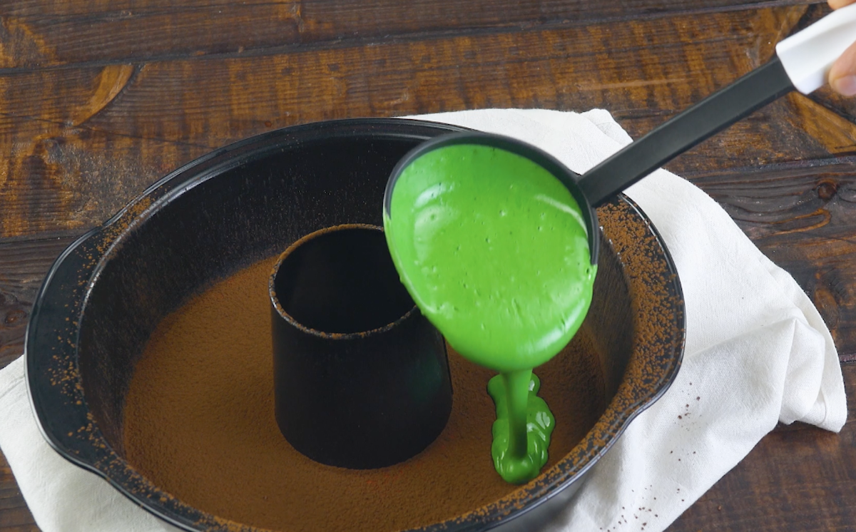 2. Fülle die Teige abwechselnd in die Gugelhupfform und siebe auf jede Teigschicht immer eine dünne Schicht Kakaopulver.