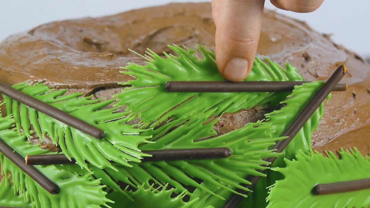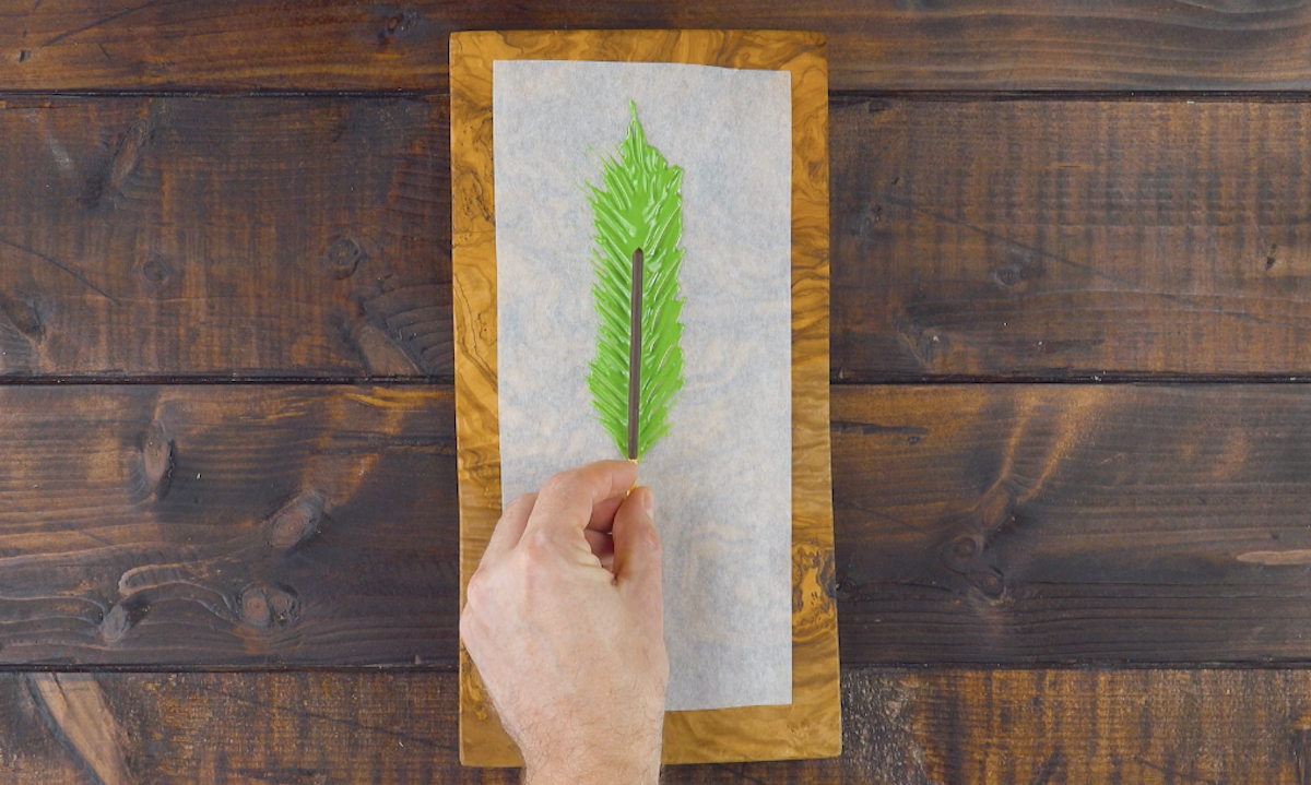 6. Für die Pinienzweige färbst du geschmolzene weiße Schokolade grün ein. Verteile die Schokolade auf einem länglichen Stück Backpapier und streiche sie von der Mitte aus mit zwei Gabeln jeweils nach links und nach rechts außen. Lege außerdem ein Mikado-Stäbchen in die Mitte. Lasse die Schokolade anziehen und dann im Kühlschrank aushärten. Löse den Zweig zum Schluss vorsichtig vom Backpapier.