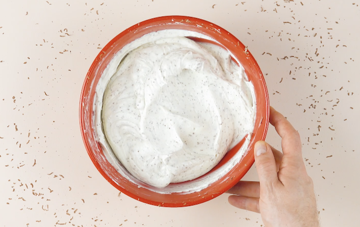 4. Gib Mascarpone, Zucker sowie das Mark einer Vanilleschote in eine Schüssel und verrühre alles mit einem Handrührgerät. Hebe geschlagene Sahne unter und reibe Schokolade hinein. Für einen besseren Halt beim späteren Zusammenbau bietet es sich hier an, 6 bis 8 Blatt Gelatine einzuarbeiten.