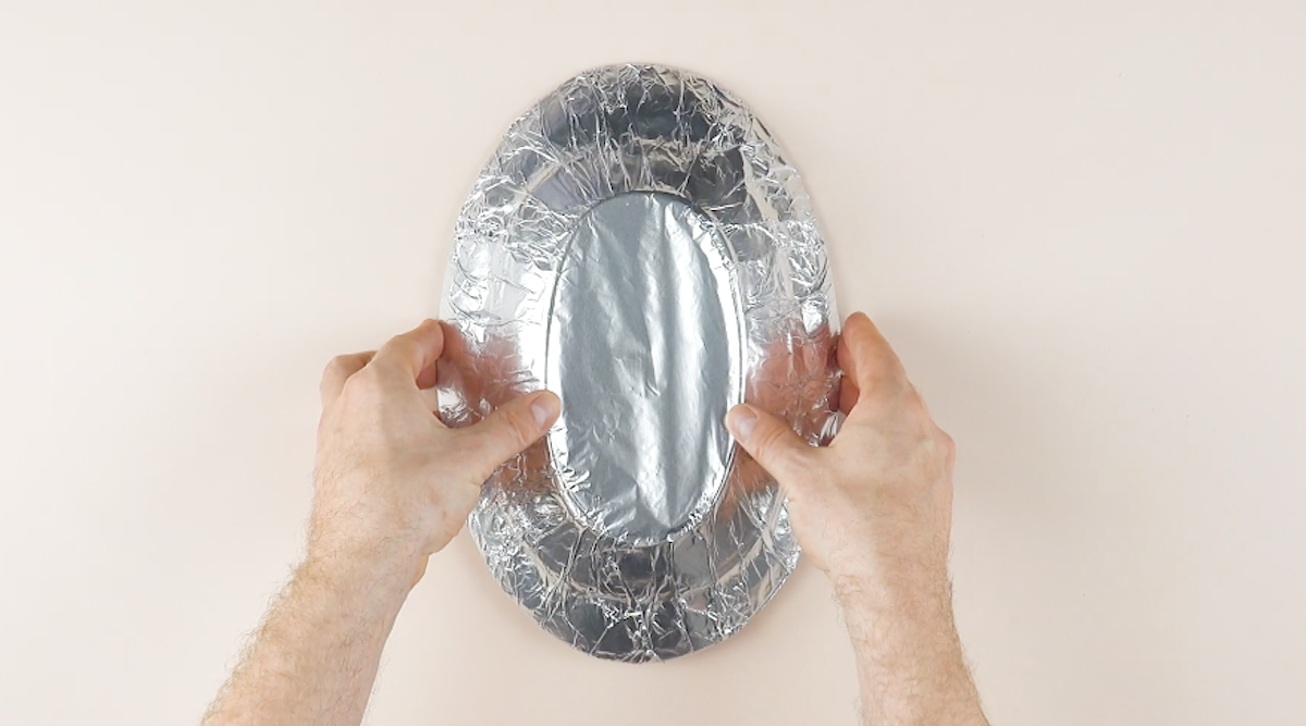 1. Wickle einen ovalen Teller mit Alufolie ein und drehe ihn um. Fette die Oberfläche komplett ein.
