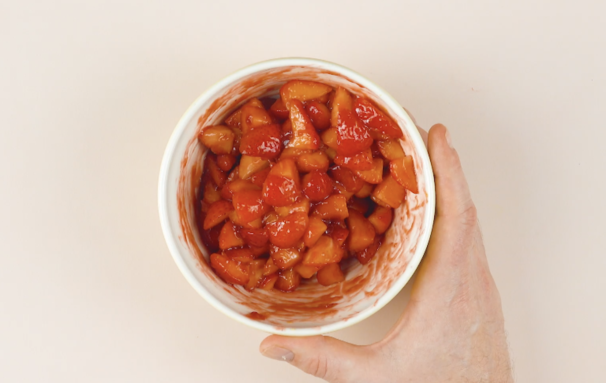 5. Schneide Erdbeeren klein und gib sie mit Erdbeermarmelade in ein Schüsselchen. Gib den Abrieb und den Saft einer Zitrone hinzu und vermenge alles miteinander.