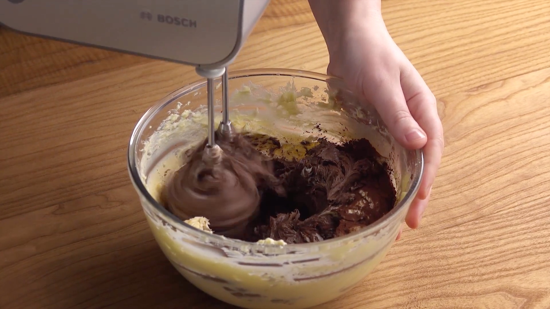 1.) Schlage Eier und Zucker mit einem Handrührgerät schaumig. Gib Buttermilch, Vanillearoma, Mehl, Kakaopulver, Backpulver und Salz zum Teig und mische ihn gründlich. Erst zum Schluss gibst du die Butter dazu und mischst den Teig ein letztes Mal.