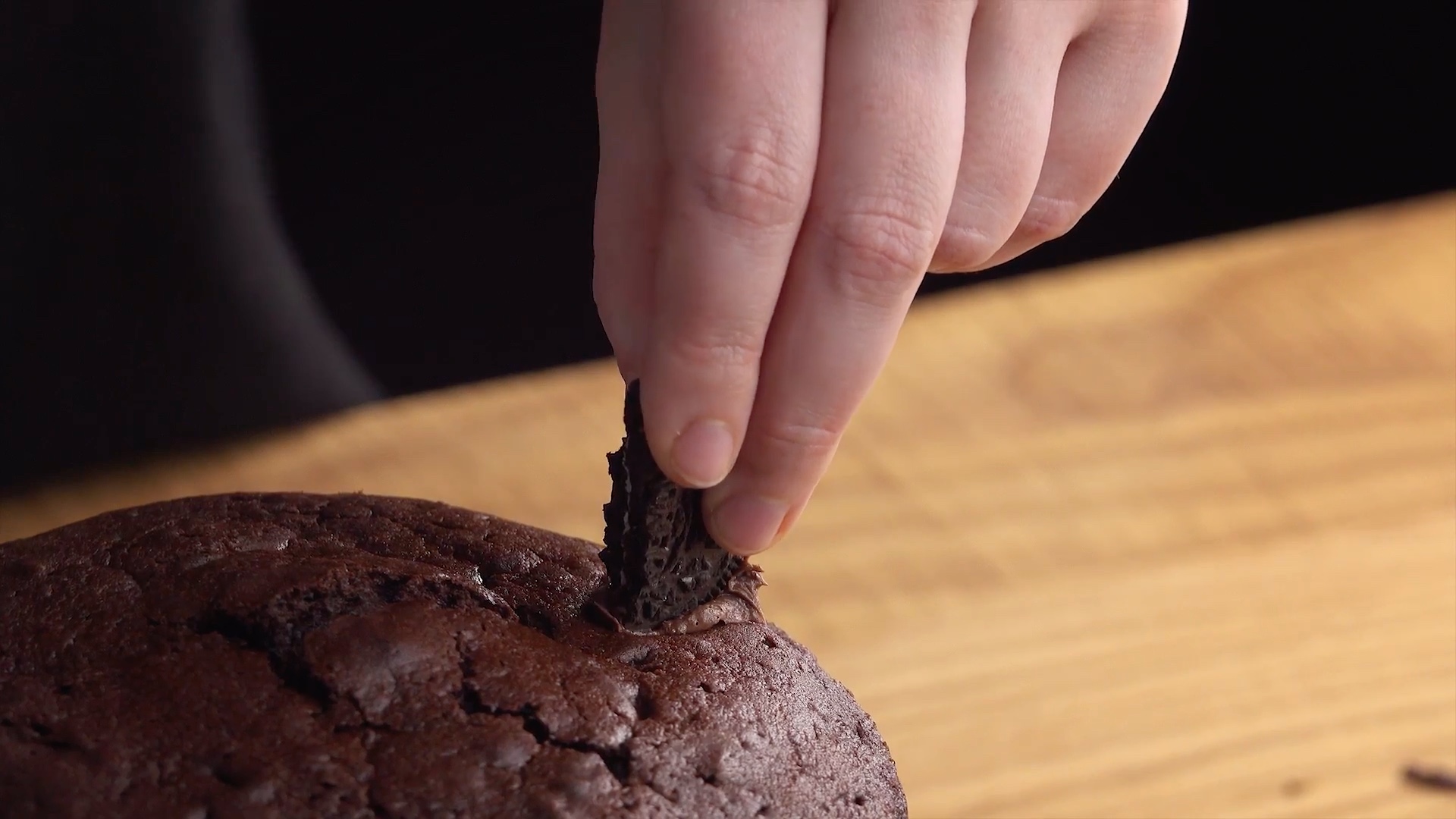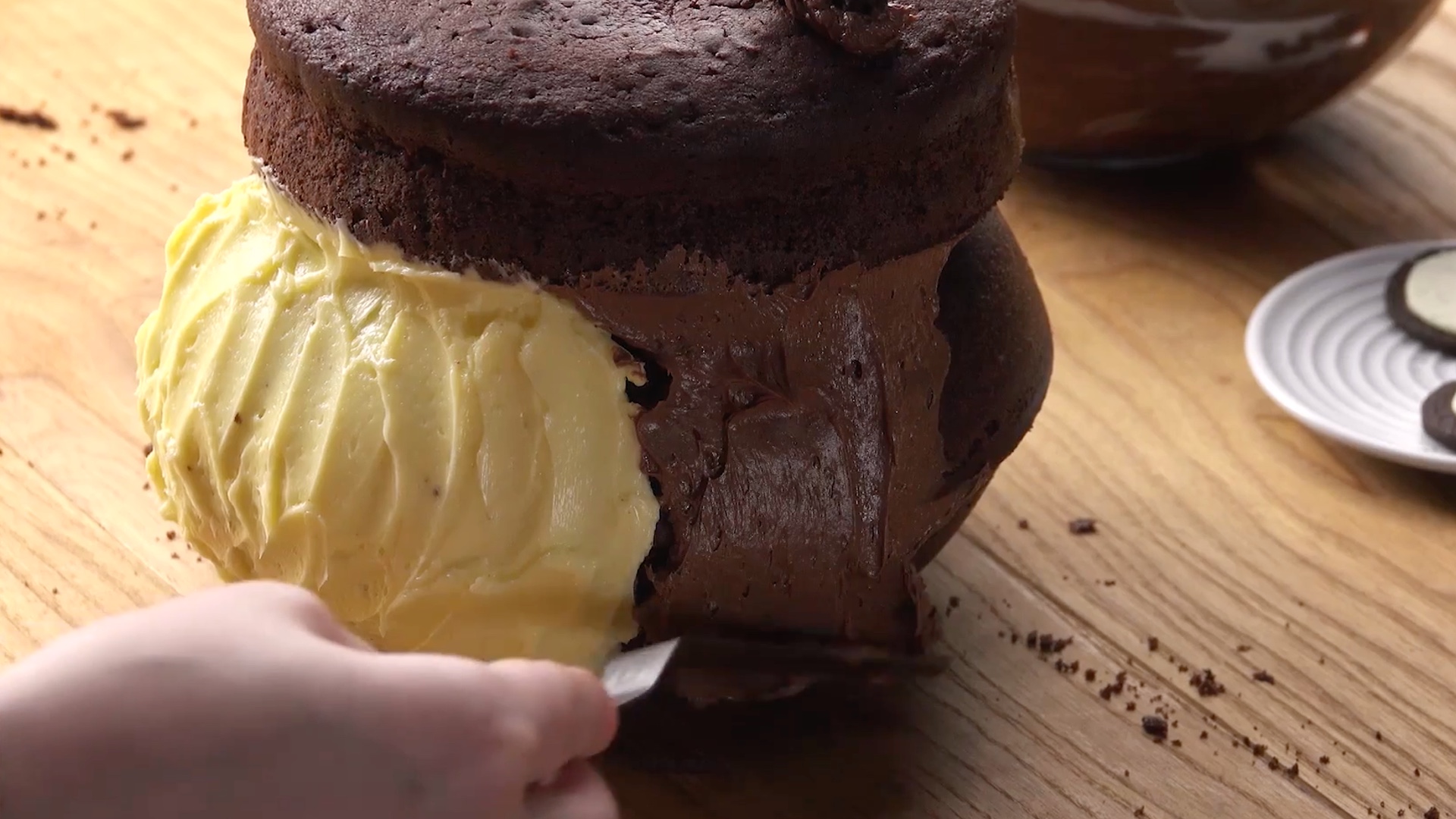 8.) Teile die Oreo-Kekse und brich je zwei Kekse ohne Creme in Hälften. Klappe die Hälften zusammen, tauche ein Ende in die Nutella-Buttercreme und drücke die Kekse in den obersten Kuchen, um der Eule Ohren zu geben.