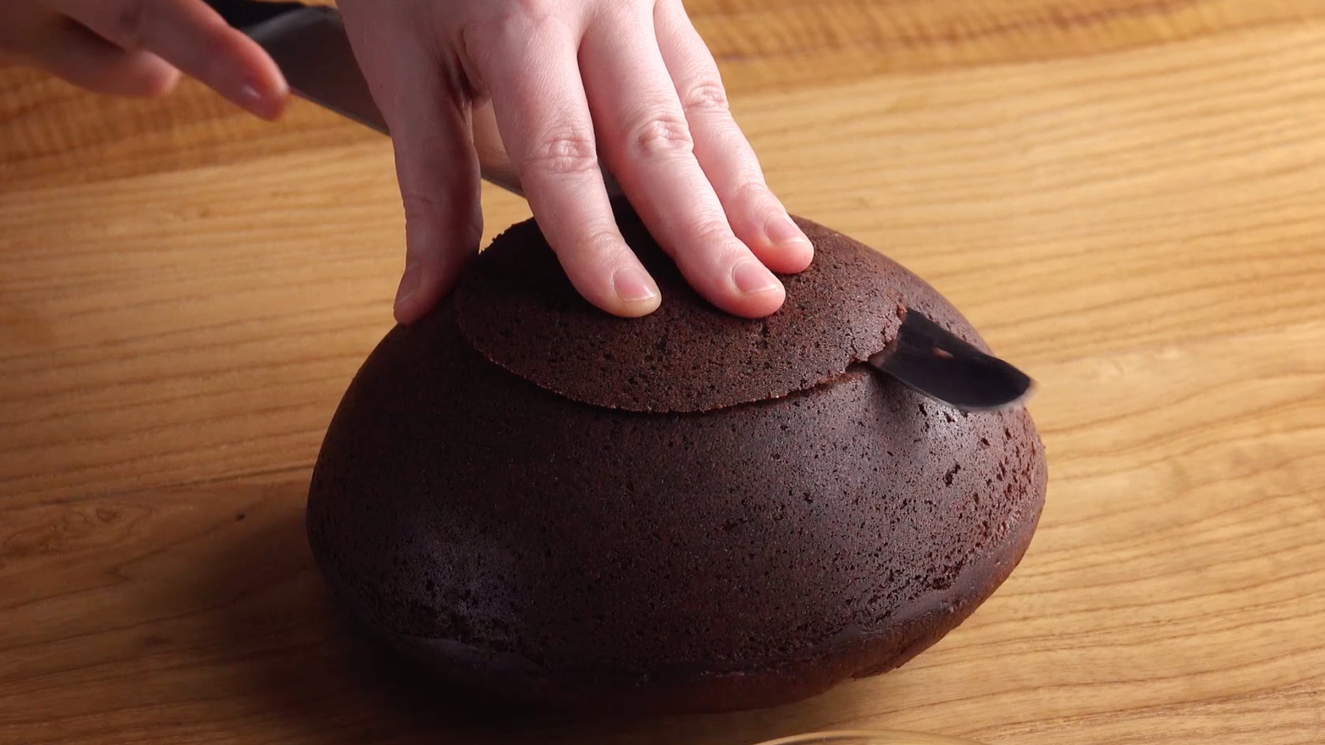 4.) Stürze die ausgekühlten Halbkugel-Kuchen aus ihren Formen und schneide eine etwa zwei Zentimeter dicke Scheibe von beiden ab.