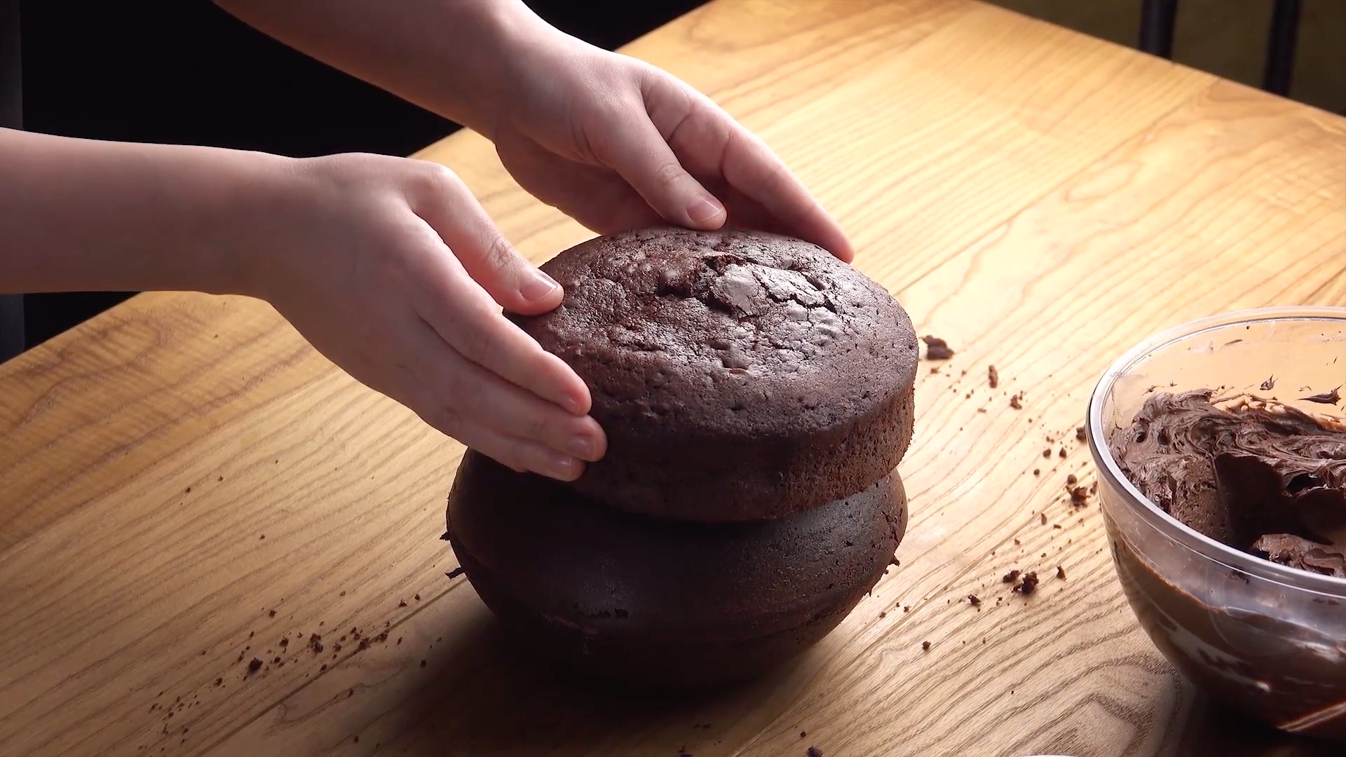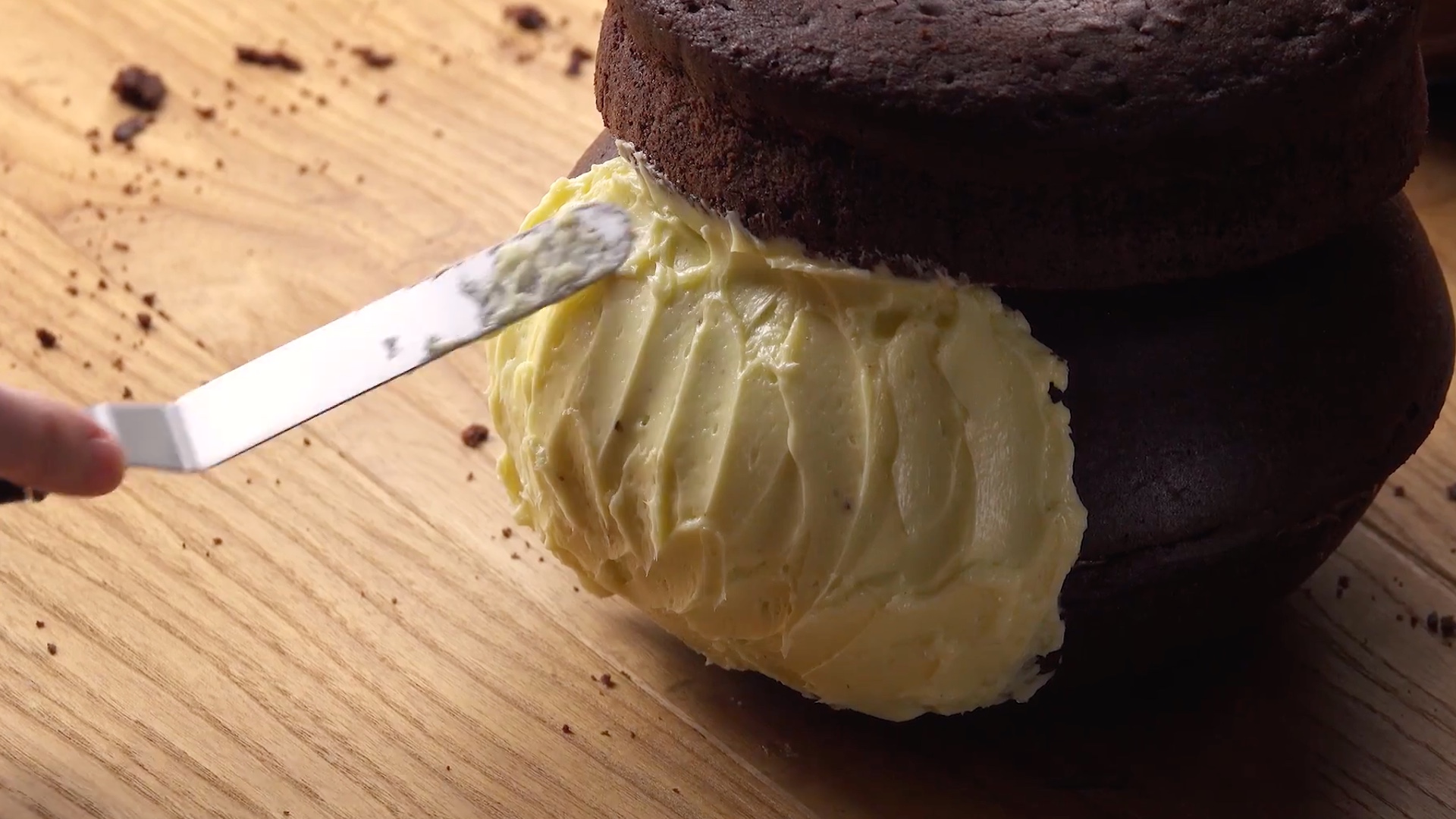 6.) Bestreiche die Schnittfläche auf der zusammengesetzten Kugel ebenfalls mit Nutella-Buttercreme und setze den dritten Kuchen aus der Springform auf.