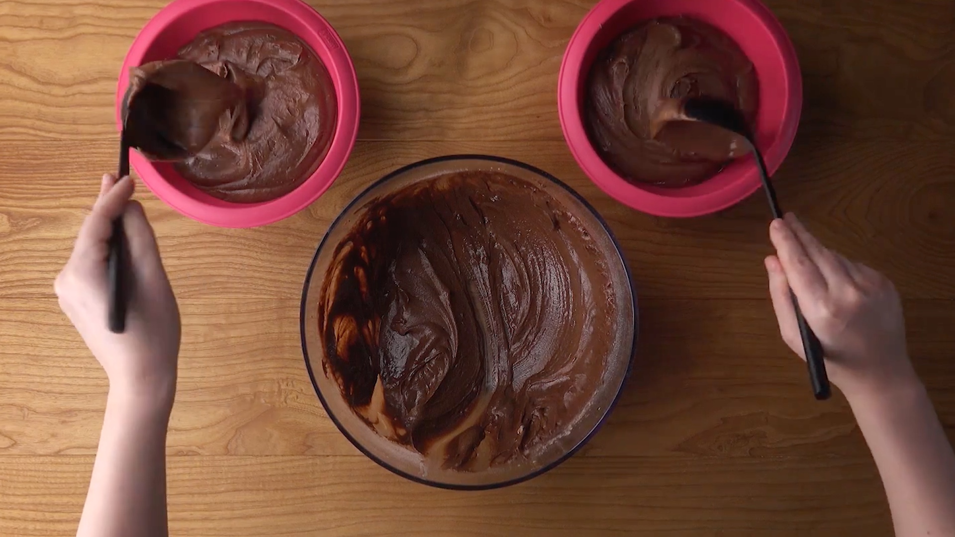 2.) Teile den Teig in drei Portionen. Zwei Portionen gibst du in je eine halbkugelförmige Backform. Das letzte Teigdrittel füllst du in eine kleine Springform (Durchmesser: 16 Zentimeter). Bei 170 °C (Umluft) werden die Kuchen für 45 Minuten gebacken.