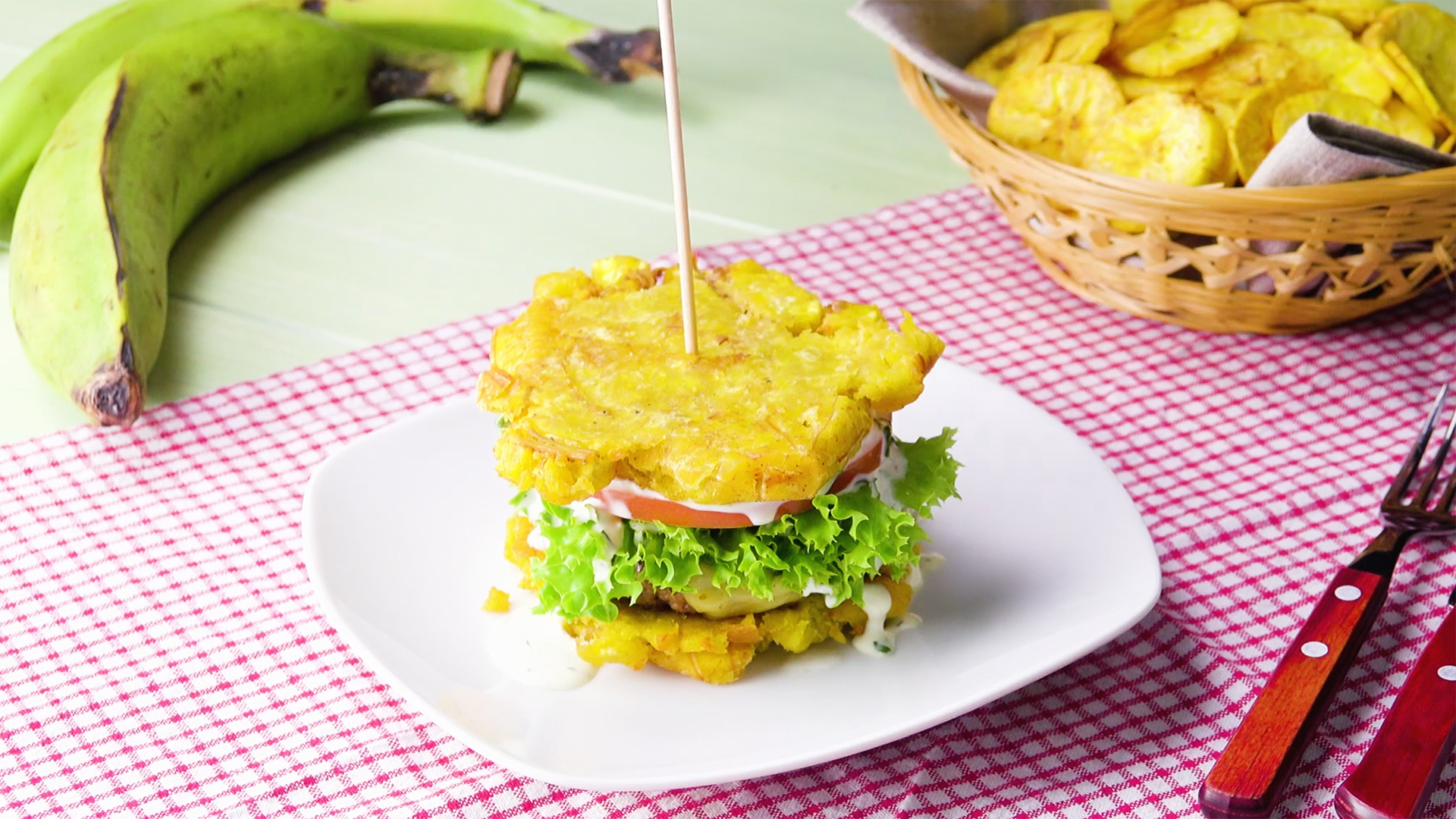 2.4) Zum Zusammensetzen des Burgers legst du zuerst einen Kochbananen-Bun auf die Arbeitsfläche. Setze ein Burgerpatty darauf und anschließend ein Salatblatt und eine Tomatenscheibe. Statt Ketchup kannst du zum zusätzlichen Würzen Kräutersoße verwenden. Zuletzt kommt ein zweiter Bananen-Bun obendrauf.