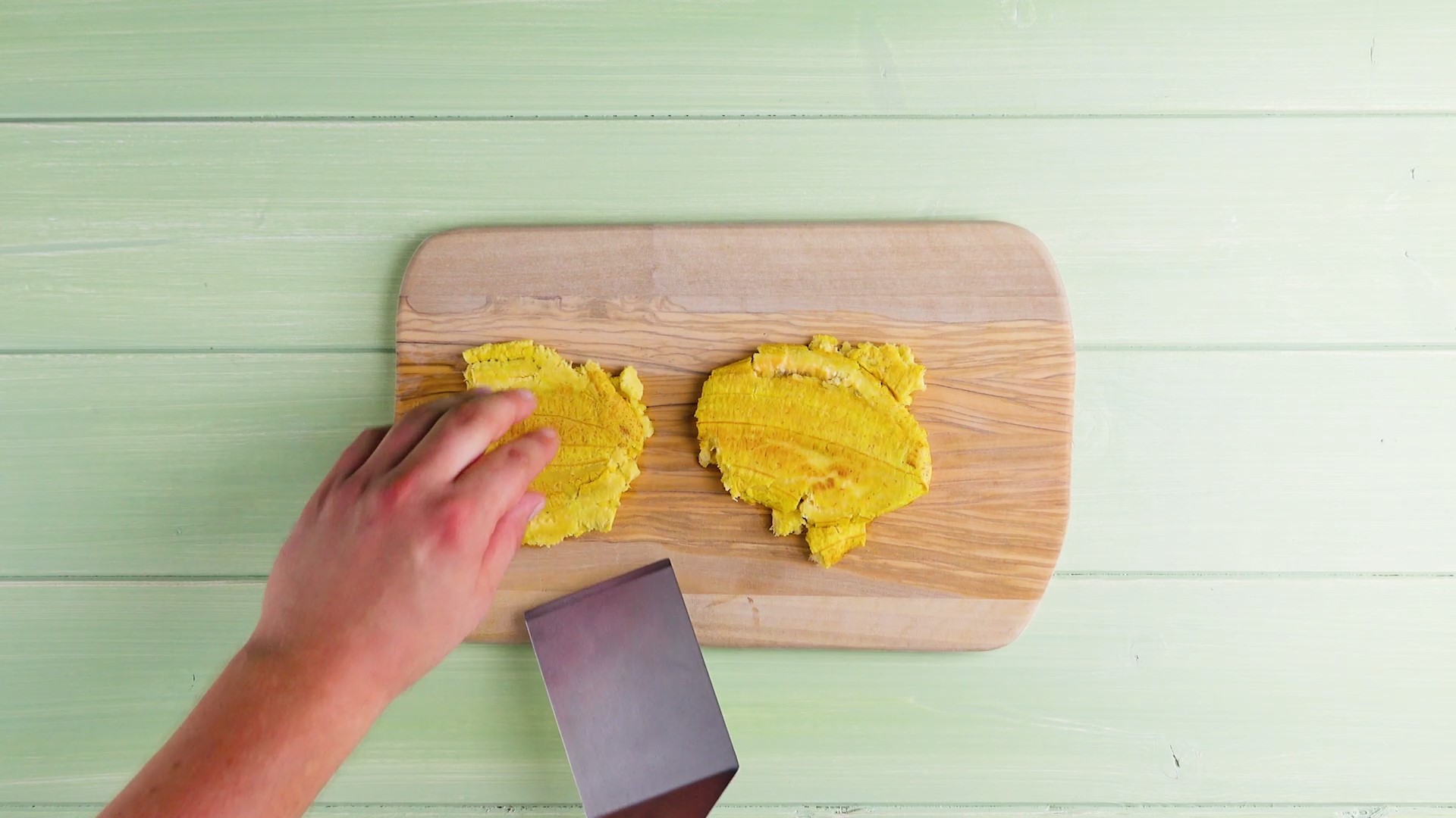 2.2) Nun kommt der interessante Teil: Beide Bananenhälften werden auf deiner Arbeitsfläche z.B. mit einem kleinen Schneidbrett plattgedrückt. Diese „Buns” werden nun noch einmal kurz im Öl frittiert und dann mit einer Schöpfkelle abgeschöpft.