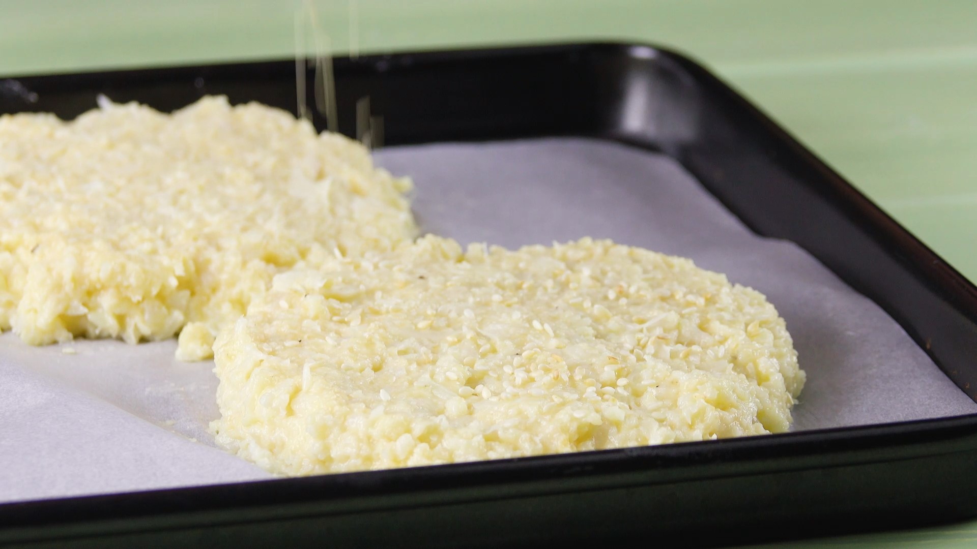Forme aus dieser Masse vier gleich große runde Platten und lege diese auf ein mit Backpapier ausgelegtes Backblech. Danach werden die „Buns” mit Sesam bestreut.