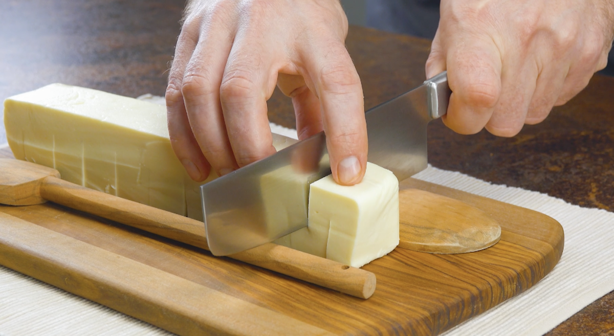 4. Lege den Mozzarella so auf ein Brett, dass die Einschnitte beider Seiten zu sehen sind. Ziehe den Mozzarella wie eine Ziehharmonika vorsichtig auseinander, sodass sich die Einschnitte ein wenig öffnen.
