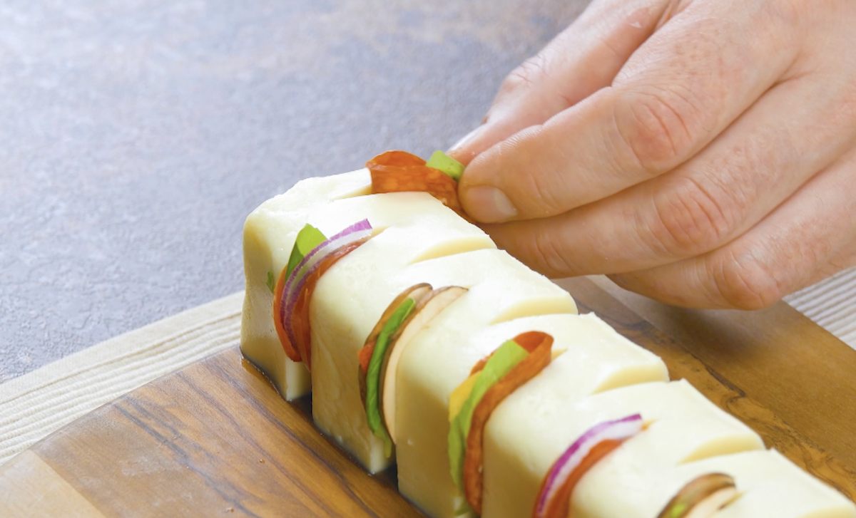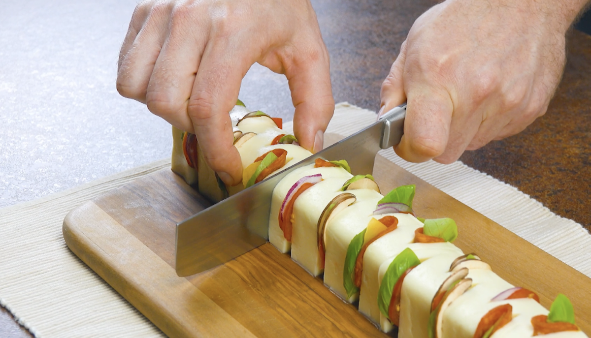 6. Schneide die fertig bestückten Mozzarellahälften in insgesamt sechs gleich lange Stücke.