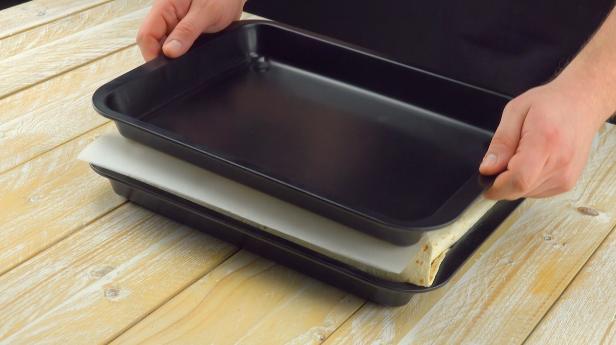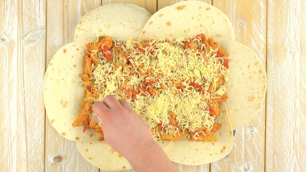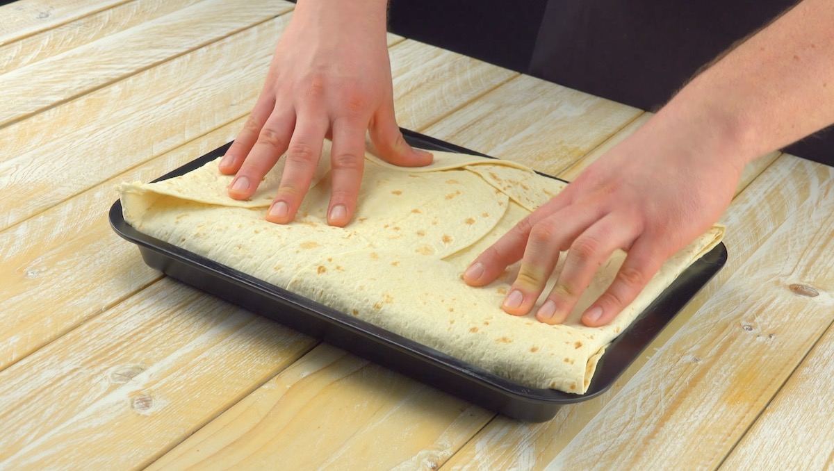 5.) Decke alles mit zwei Tortillas zu und klappe die an den Seiten des Blechs überstehenden Tortillas nach innen zusammen.