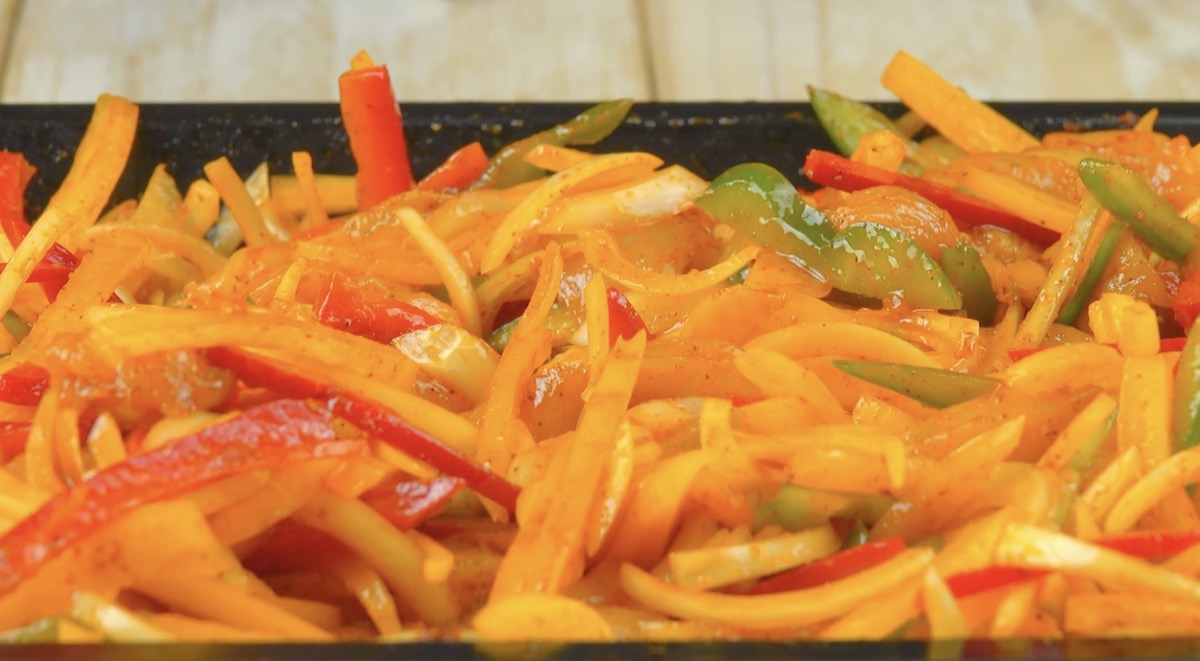 1.) Als Erstes bereitest du die Fajita-Gewürzmischung zu. Gib alle Zutaten in eine Schüssel und vermenge sie gut. Dann schneidest du die Paprika, die Zwiebeln und die Hähnchenbrust klein und gibst alles auf ein Blech. Würze das Gemüse und das Fleisch mit 2 EL Fajita-Gewürz. Verteile noch 3 EL Olivenöl auf dem Blech und vermenge alles sorgfältig miteinander. Achte darauf, dass die Zutaten gleichmäßig auf dem Blech verteilt sind. Gib dieses dann bei 200 °C Umluft für 25 Minuten in den Ofen.