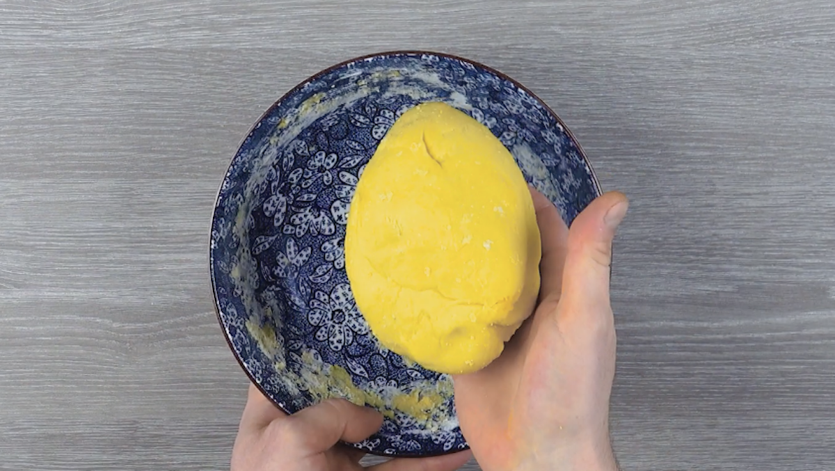 2. Füge nun Mehl, Stärke, Kurkuma, Salz, Zucker und ein Ei hinzu und verknete alles zu einem Teig.