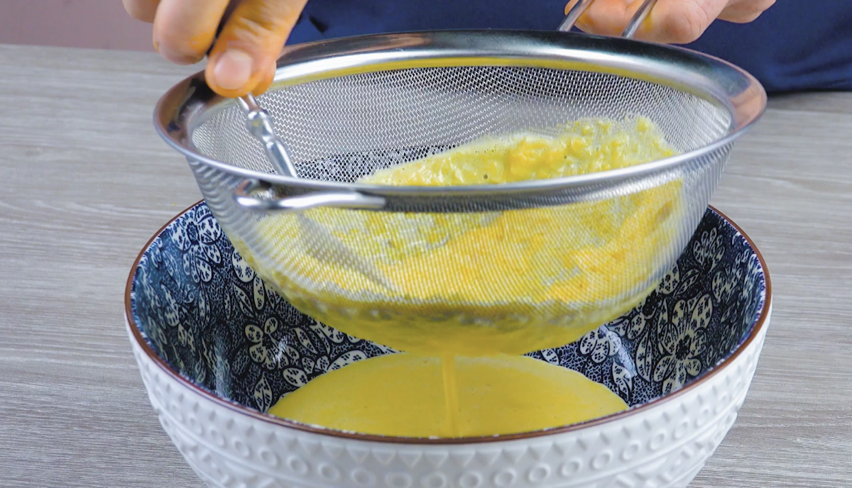1. Erwärme Milch in einem Topf und gib Butter hinzu. Löse die Körner vom Maiskolben und gib sie zur Milch mit in den Topf. Füge Trockenhefe hinzu und püriere alles mit einem Stabmixer. Gieße die Flüssigkeit danach durch ein Sieb in eine Schüssel.