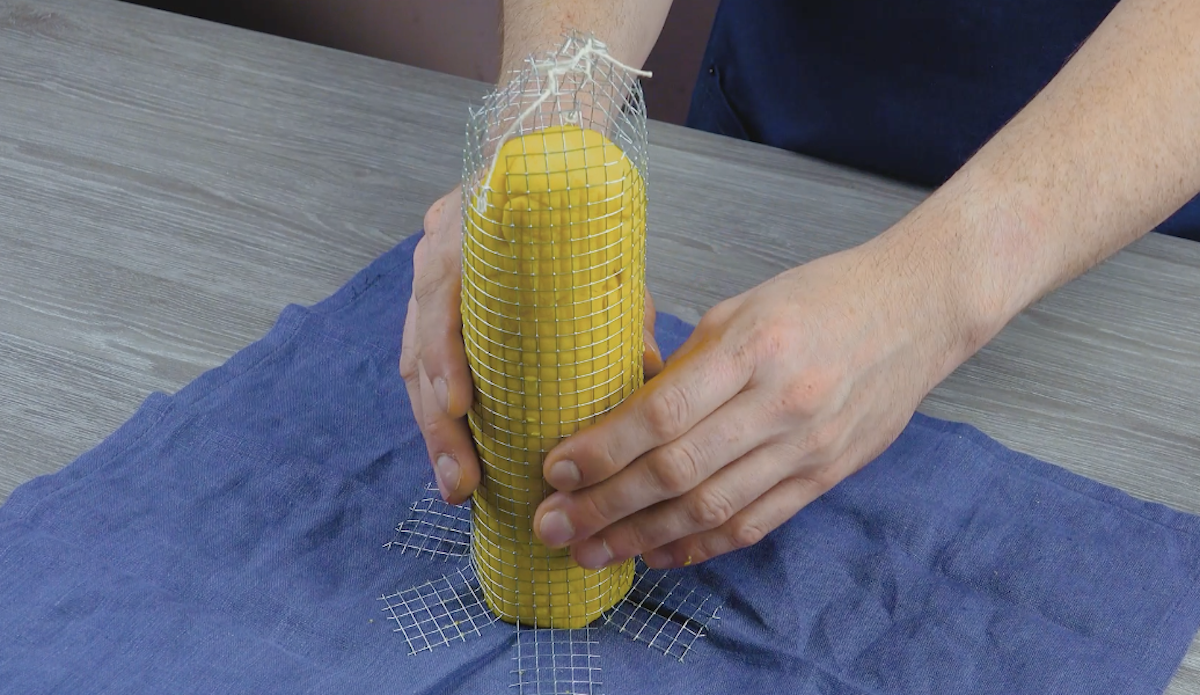 4. Schneide aus dem Drahtgitter an einem Ende 4 Dreiecke aus und am anderen Ende 5-mal senkrecht hinein. Lege die Teigrolle auf das Gitter, biege dieses um den Teig und nähe es an den Enden zusammen. Biege dann die eingeschnittenen Seiten nach außen, sodass das gefüllte Gitter stehen kann. Die andere Seite (die mit den Dreiecken) nähst du ebenfalls zusammen. Stelle das Gitter mit Teig erst einmal bei 40 °C Ober- und Unterhitze für 40 Minuten in den Ofen (Teig gehen lassen) und backe es dann bei 180 °C für weitere 35 Minuten. Lass das Maisbrot etwa eine Stunde auskühlen, bevor du es vorsichtig aus dem Gitter löst.