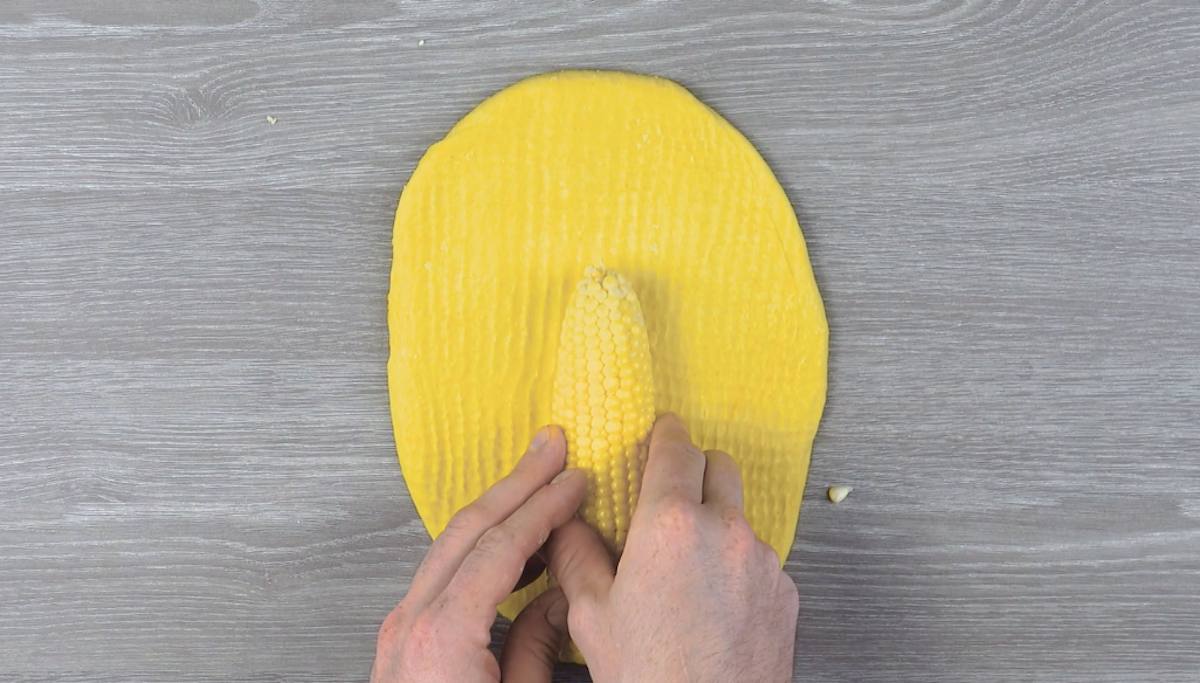 3. Rolle den Teig mit einem Maiskolben aus und wickle ihn dann um den Kolben herum.