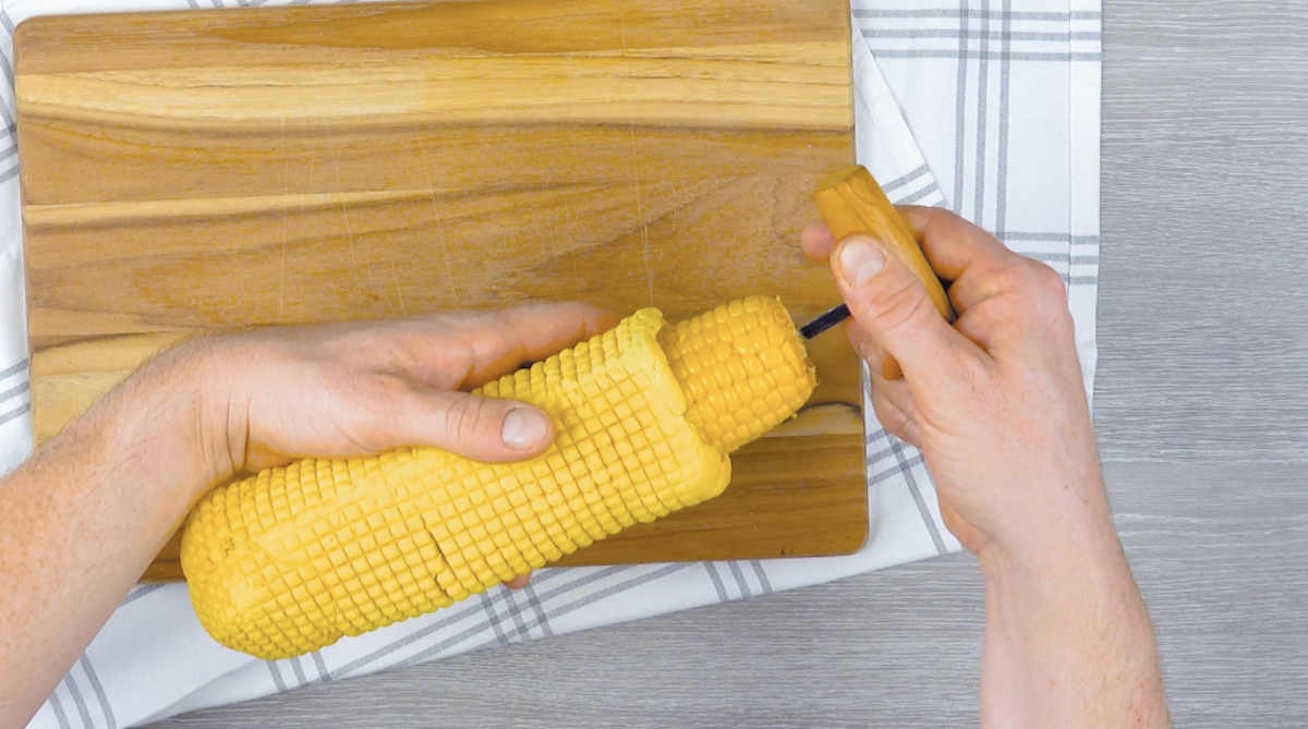 5. Stecke einen Korkenzieher in den im Teig befindlichen Maiskolben und ziehe ihn aus seiner Hülle heraus.