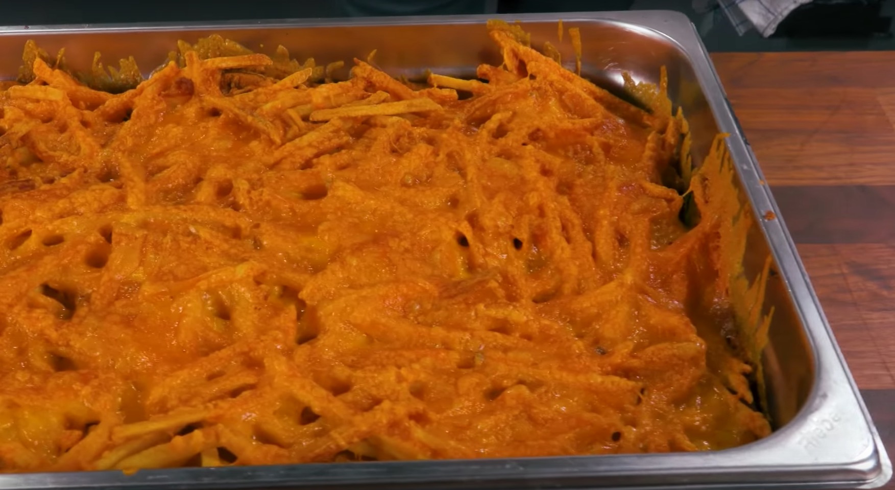 Setze nun die zuvor beiseite gestellten Brötchen-„Oberteile“ auf den Käse und nimm dich dann der Überraschungszutat an: Als nächste Schicht bereichern nämlich die Pommes frites die Form. Als Letztes kommt noch eine dicke Schicht aus geriebenem Käse obenauf.