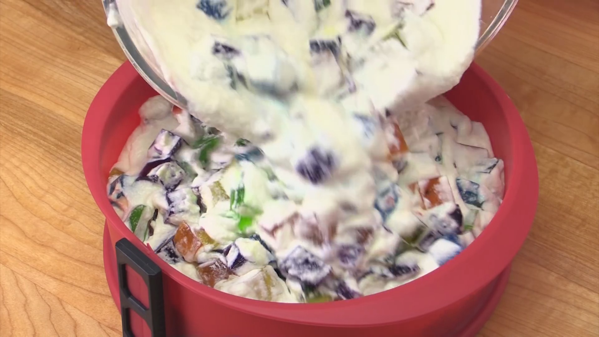 Dann nimmt man die kalte Götterspeise aus dem Kühlschrank, schneidet sie zu Würfeln und gibt sie in die Sahne. ACHTUNG: Man sollte sie nicht verrühren, denn sie können leicht reißen. Anschließend gibt man alles in die Springform.