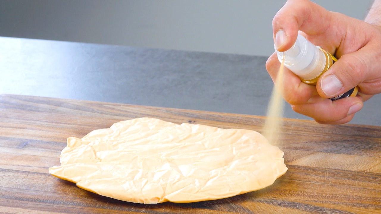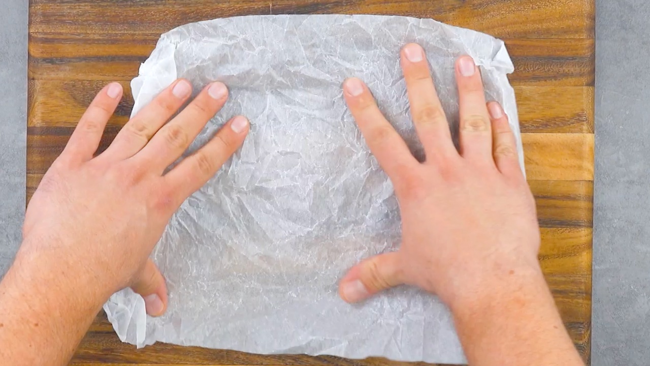 1. Beginne damit, das „Goldpapier“ herzustellen. Zerknülle dafür das Backpapier grob, falte es danach wieder auseinander und lege es ausgebreitet auf ein Brett.