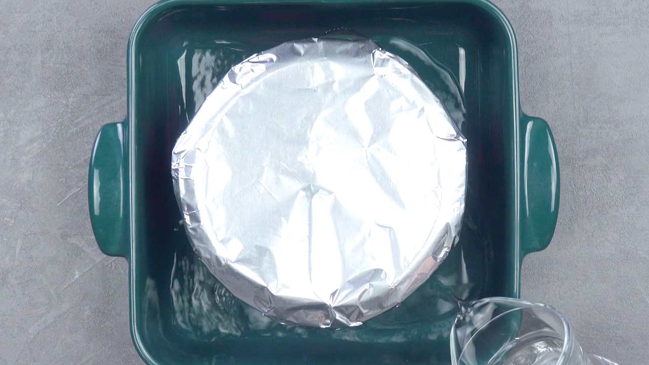 7. Decke die Silikonform mit Alufolie ab, stelle sie in eine Auflaufform und fülle diese mit heißem Wasser. Backe den Flan danach im Wasserbad für etwa 60 Minuten bei 160 °C Umluft.