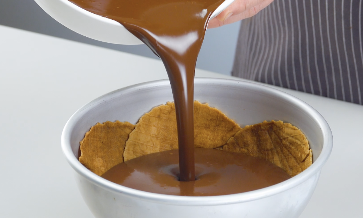 6. Temperiere für den Überzug Schokolade und hebe gehackte Nüsse unter. Nimm die Waffel-Ganache-Schalen aus dem Kühlschrank und entferne die kleinen, mit Folie umwickelten Schüsseln aus deren Mitte. Stürze die großen Schalen dann auf ein Gitter.