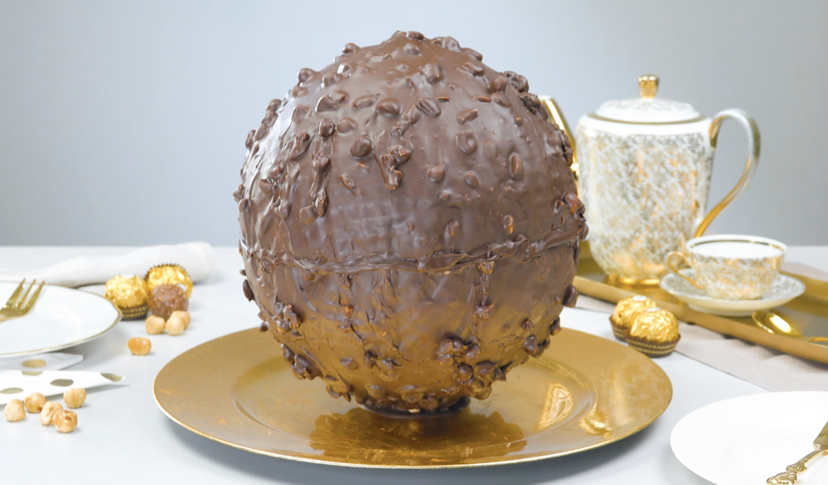 Seit fast 40 Jahren ist Ferrero Rocher nun schon der Liebling im Supermarktregal. Die in goldenes Papier eingepackte Schoko-Nuss-Praline schmeckt nicht nur verboten gut, sie eignet sich aufgrund ihres edlen Aussehens auch bestens als kleine Aufmerksamkeit. Wenn dir aber ihre Größe doch noch nicht ausreichend erscheint und der Schokogenuss gar nicht groß genug sein kann, solltest du jetzt ganz genau aufpassen. Wir zeigen dir, wie man Ferrero Rocher in Übergröße herstellt.